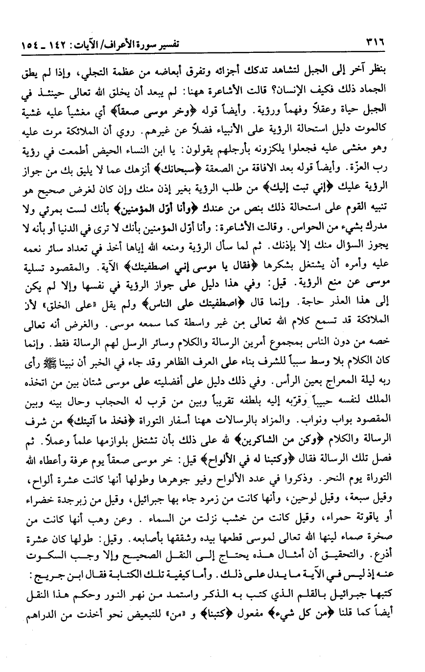 وأيضا قوله بعد الافاقة من الصعقة سُبْحانَكَ أنزهك عما لا يليق بك من جواز الرؤية عليك إِنِّي تُبْتُ إِلَيْكَ من طلب الرؤية بغير إذن منك وإن كان لغرض صحيح هو تنبيه القوم على استحالة ذلك بنص من عندك وَأَنَا أَوَّلُ الْمُؤْمِنِينَ بأنك لست بمرئي ولا مدرك بشيء من الحواس. وقالت الأشاعرة: وأنا أوّل المؤمنين بأنك لا ترى في الدنيا أو بأنه لا يجوز السؤال منك إلا بإذنك. ثم لما سأل الرؤية ومنعه الله إياها أخذ في تعداد سائر نعمه عليه وأمره أن يشتغل بشكرها ف قالَ يا مُوسى إِنِّي اصْطَفَيْتُكَ الآية. والمقصود تسلية موسى عن منع الرؤية. قيل: وفي هذا دليل على جواز الرؤية في نفسها وإلا لم يكن إلى هذا العذر حاجة. وإنما قال اصْطَفَيْتُكَ عَلَى النَّاسِ ولم يقل «على الخلق» لأن الملائكة قد تسمع كلام الله تعالى من غير واسطة كما سمعه موسى. والغرض أنه تعالى خصه من دون الناس بمجموع أمرين الرسالة والكلام وسائر الرسل لهم الرسالة فقط. وإنما كان الكلام بلا وسط سببا للشرف بناء على العرف الظاهر