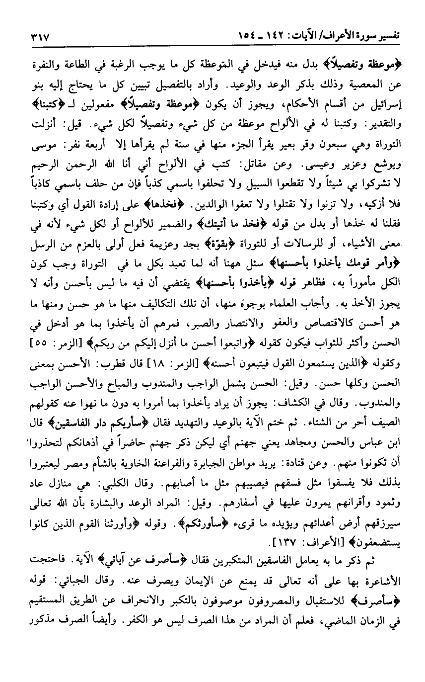 ثم ذكر ما به يعامل الفاسقين المتكبرين فقال سَأَصْرِفُ عَنْ آياتِيَ الآية. فاحتجت الأشاعرة بها على أنه تعالى قد يمنع عن الإيمان ويصرف عنه. وقال الجبائي: قوله سَأَصْرِفُ للاستقبال والمصروفون موصوفون بالتكبر والانحراف عن الطريق المستقيم في الزمان الماضي، فعلم أن المراد من هذا الصرف ليس هو الكفر. وأيضا الصرف مذكور