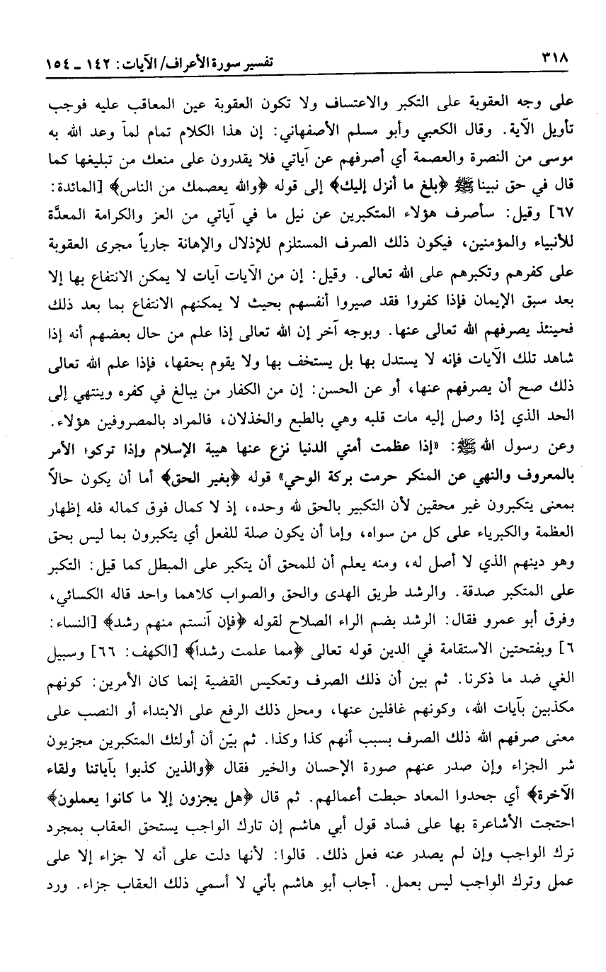 6] وبفتحتين الاستقامة في الدين قوله تعالى مِمَّا عُلِّمْتَ رُشْداً [الكهف: 66] وسبيل الغي ضد ما ذكرنا. ثم بين أن ذلك الصرف وتعكيس القضية إنما كان الأمرين: كونهم مكذبين بآيات الله، وكونهم غافلين عنها، ومحل ذلك الرفع على الابتداء أو النصب على معنى صرفهم الله ذلك الصرف بسبب أنهم كذا وكذا. ثم بيّن أن أولئك المتكبرين مجزيون شر الجزاء وإن صدر عنهم صورة الإحسان والخير فقال وَالَّذِينَ كَذَّبُوا بِآياتِنا وَلِقاءِ الْآخِرَةِ أي جحدوا المعاد حبطت أعمالهم. ثم قال هَلْ يُجْزَوْنَ إِلَّا ما كانُوا يَعْمَلُونَ احتجت الأشاعرة بها على فساد قول أبي هاشم إن تارك الواجب يستحق العقاب بمجرد ترك الواجب وإن لم يصدر عنه فعل ذلك. قالوا: لأنها دلت على أنه لا جزاء إلا على عمل وترك الواجب ليس بعمل. أجاب أبو هاشم بأني لا أسمي ذلك العقاب جزاء. ورد