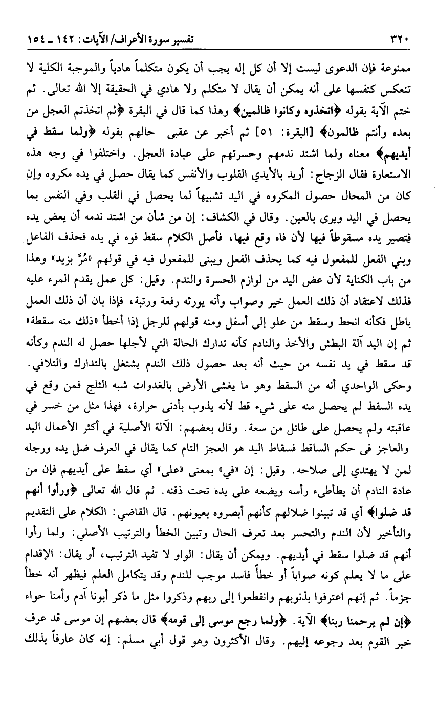 ممنوعة فإن الدعوى ليست إلا أن كل إله يجب أن يكون متكلما هاديا والموجبة الكلية لا تنعكس كنفسها على أنه يمكن أن يقال لا متكلم ولا هادي في الحقيقة إلا الله تعالى. ثم ختم الآية بقوله اتَّخَذُوهُ وَكانُوا ظالِمِينَ وهذا كما قال في البقرة ثُمَّ اتَّخَذْتُمُ الْعِجْلَ مِنْ بَعْدِهِ وَأَنْتُمْ ظالِمُونَ [البقرة: 51] ثم أخبر عن عقبى حالهم بقوله وَلَمَّا سُقِطَ فِي أَيْدِيهِمْ معناه ولما اشتد ندمهم وحسرتهم على عبادة العجل. واختلفوا في وجه هذه الاستعارة فقال الزجاج: أريد بالأيدي القلوب والأنفس كما يقال حصل في يده مكروه وإن كان من المحال حصول المكروه في اليد تشبيها لما يحصل في القلب وفي النفس بما يحصل في اليد ويرى بالعين. وقال في الكشاف: إن من شأن من اشتد ندمه أن يعض يده فتصير يده مسقوطا فيها لأن فاه وقع فيها، فأصل الكلام سقط فوه في يده فحذف الفاعل وبني الفعل للمفعول فيه كما يحذف الفعل ويبنى للمفعول فيه في قولهم «مرّ بزيد» وهذا من باب الكناية لأن عض اليد من لوازم الحسرة والندم. وقيل: كل عمل يقدم المرء عليه فذلك لاعتقاد أن ذلك العمل خير وصواب وأنه يورثه رفعة ورتبة، فإذا بان أن ذلك العمل باطل فكأنه انحط وسقط من علو إلى أسفل ومنه قولهم للرجل إذا أخطأ «ذلك منه سقطة» ثم إن اليد آلة البطش والأخذ والنادم كأنه تدارك الحالة التي لأجلها حصل له الندم وكأنه قد سقط في يد نفسه من حيث أنه بعد حصول ذلك الندم يشتغل بالتدارك والتلافي.
