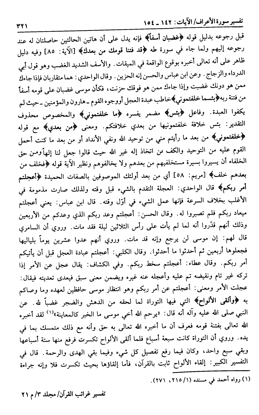 قبل رجوعه بدليل قوله غَضْبانَ أَسِفاً فإنه يدل على أن هاتين الحالتين حاصلتان له عند رجوعه إليهم ولما جاء في سورة طه قَدْ فَتَنَّا قَوْمَكَ مِنْ بَعْدِكَ [الآية: 85] وفيه دليل ظاهر على أنه تعالى أخبره بوقوع الواقعة في الميقات. والأسف الشديد الغضب وهو قول أبي الدرداء والزجاج. وعن ابن عباس والحسن إنه الحزين. وقال الواحدي: هما متقاربان فإذا جاءك ممن هو دونك غضبت وإذا جاءك ممن هو فوقك حزنت، فكأن موسى غضبان على قومه أسفا من فتنة ربه بِئْسَما خَلَفْتُمُونِي خاطب عبدة العجل أو وجوه القوم- هارون والمؤمنين- حيث لم يكفوا العبدة. وفاعل بِئْسَما مضمر يفسره خَلَفْتُمُونِي والمخصوص محذوف التقدير: بئس خلافة خلفتمونيها من بعدي خلافتكم. ومعنى مِنْ بَعْدِي مع قوله خَلَفْتُمُونِي من بعد ما رأيتم مني من توحيد الله ونفي الأنداد أو من بعد ما كنت أحمل القوم عليه من التوحيد والكف عن اتخاذ إله غير الله حيث قالوا جعل لنا إلها ومن حق الخلفاء أن يسيروا بسيرة مستخلفيهم من بعدهم ولا يخالفوهم ونظير الآية قوله فَخَلَفَ مِنْ بَعْدِهِمْ خَلْفٌ [مريم: 58] أي من بعد أولئك الموصوفين بالصفات الحميدة أَعَجِلْتُمْ أَمْرَ رَبِّكُمْ قال الواحدي: العجلة التقدم بالشيء قبل وقته ولذلك صارت مذمومة في الأغلب بخلاف السرعة فإنها عمل الشيء في أوّل وقته. قال ابن عباس: يعني أعجلتم ميعاد ربكم فلم تصبروا له. وقال الحسن: أعجلتم وعد ربكم الذي وعدكم من الأربعين وذلك أنهم قدّروا أنه لما لم يأت على رأس الثلاثين ليلة فقد مات.