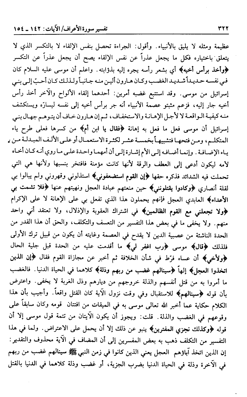 من كسرها فعلى طرح ياء المتكلم، ومن فتحها فتشبيها بخمسة عشر لكثرة الاستعمال أو على الألف المبدلة من ياء الإضافة. وإنما أضافه إلى الأم إشارة إلى أن أمهما واحدة على ما روي أنه كان أخاه لأمه ليكون أدعى إلى العطف والرقة لأنها كانت مؤمنة فافتخر بنسبها ولأنها هي التي تحملت فيه الشدائد فذكره حقها إِنَّ الْقَوْمَ اسْتَضْعَفُونِي استذلوني وقهروني ولم يبالوا بي لقلة أنصاري وَكادُوا يَقْتُلُونَنِي حين منعتهم عبادة العجل ونهيتهم عنها فَلا تُشْمِتْ بِيَ الْأَعْداءَ العابدي العجل فإنهم يحملون هذا الذي تفعل بي على الإهانة لا على الإكرام وَلا تَجْعَلْنِي مَعَ الْقَوْمِ الظَّالِمِينَ في اشتراك العقوبة والإذلال، ولا تعتقد أني واحد منهم. ولا يخفى ما في بعض هذا التفسير من التعسف والتكلف، والحق أن هذا القدر من الحدة الناشئة من عصبية الدين لا يقدح في العصمة وغايته أن يكون من قبيل ترك الأولى فلذلك قالَ موسى رَبِّ اغْفِرْ لِي ما أقدمت عليه من الحدة قبل جلية الحال وَلِأَخِي أن عساه فرّط في شأن الخلافة ثم أخبر عن مجازاة القوم فقال إِنَّ الَّذِينَ اتَّخَذُوا الْعِجْلَ إلها سَيَنالُهُمْ غَضَبٌ مِنْ رَبِّهِمْ وَذِلَّةٌ كلاهما في الحياة الدنيا. فالغضب ما أمروا به من قتل أنفسهم والذلة خروجهم من ديارهم وذل الغربة لا يخفى. واعترض بأن قوله سَيَنالُهُمْ للاستقبال وفي وقت نزول الآية كان القتل واقعا. وأجيب بأن هذا الكلام حكاية عما أخبر الله تعالى موسى به في الميقات من افتتان قومه وكان سابقا على وقوعهم في الغضب والذلة. قلت: ويجوز أن يكون الآيتان من تتمة قول موسى إلا أن قوله وَكَذلِكَ نَجْزِي الْمُفْتَرِينَ ينبو عن ذلك إلا أن يحمل على الاعتراض. ولما في هذا التفسير من التكلف ذهب به بعض المفسرين إلى أن المضاف في الآية محذوف والتقدير: