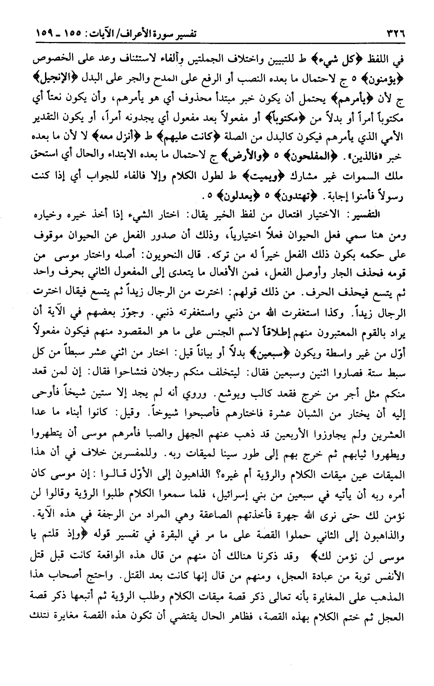 الاختيار افتعال من لفظ الخير يقال: اختار الشيء إذا أخذ خيره وخياره ومن هنا سمي فعل الحيوان فعلا اختياريا، وذلك أن صدور الفعل عن الحيوان موقوف على حكمه بكون ذلك الفعل خيرا له من تركه. قال النحويون: أصله واختار موسى من قومه فحذف الجار وأوصل الفعل، فمن الأفعال ما يتعدى إلى المفعول الثاني بحرف واحد ثم يتسع فيحذف الحرف. من ذلك قولهم: اخترت من الرجال زيدا ثم يتسع فيقال اخترت الرجال زيدا. وكذا استغفرت الله من ذنبي واستغفرته ذنبي. وجوّز بعضهم في الآية أن يراد بالقوم المعتبرون منهم إطلاقا لاسم الجنس على ما هو المقصود منهم فيكون مفعولا أوّل من غير واسطة ويكون سَبْعِينَ بدلا أو بيانا قيل: اختار من اثني عشر سبطا من كل سبط ستة فصاروا اثنين وسبعين فقال: ليتخلف منكم رجلان فتشاحوا فقال: إن لمن قعد منكم مثل أجر من خرج فقعد كالب ويوشع.