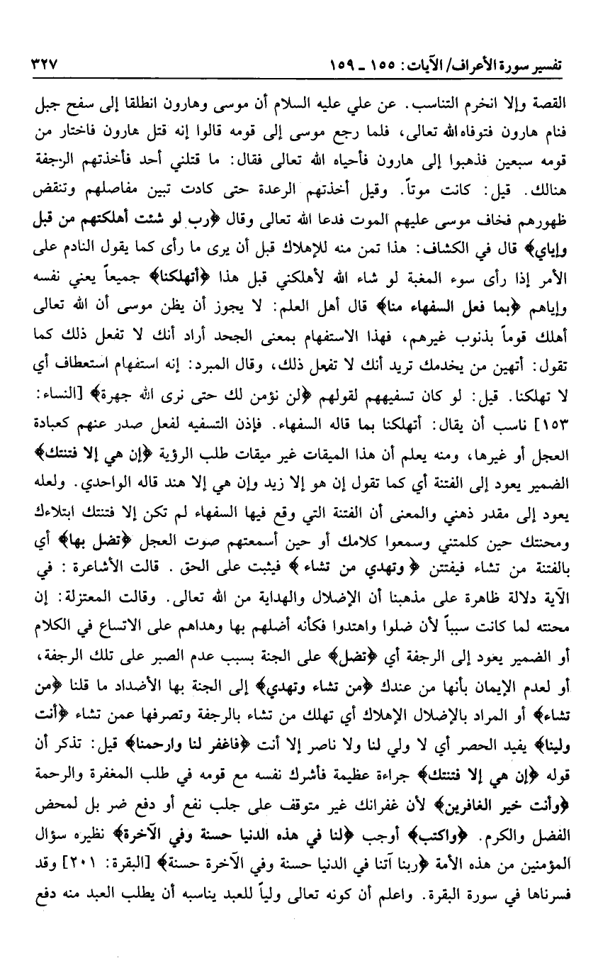 153] ناسب أن يقال: أتهلكنا بما قاله السفهاء. فإذن التسفيه لفعل صدر عنهم كعبادة العجل أو غيرها، ومنه يعلم أن هذا الميقات غير ميقات طلب الرؤية إِنْ هِيَ إِلَّا فِتْنَتُكَ الضمير يعود إلى الفتنة أي كما تقول إن هو إلا زيد وإن هي إلا هند قاله الواحدي. ولعله يعود إلى مقدر ذهني والمعنى أن الفتنة التي وقع فيها السفهاء لم تكن إلا فتنتك ابتلاءك ومحنتك حين كلمتني وسمعوا كلامك أو حين أسمعتهم صوت العجل تُضِلُّ بِها أي بالفتنة من تشاء فيفتتن وَتَهْدِي مَنْ تَشاءُ فيثبت على الحق. قالت المعتزلة: إن محنته لما كانت سببا لأن ضلوا واهتدوا فكأنه أضلهم بها وهداهم على الاتساع في الكلام أو الضمير يعود إلى الرجفة أي تُضِلُّ على الجنة بسبب عدم الصبر على تلك الرجفة، أو لعدم الإيمان بأنها من عندك مَنْ تَشاءُ وَتَهْدِي إلى الجنة بها الأضداد ما قلنا مَنْ تَشاءُ أو المراد بالإضلال الإهلاك أي تهلك من تشاء بالرجفة وتصرفها عمن تشاء أَنْتَ وَلِيُّنا يفيد الحصر أي لا ولي لنا ولا ناصر إلا أنت فَاغْفِرْ لَنا وَارْحَمْنا قيل: تذكر أن قوله إِنْ هِيَ إِلَّا فِتْنَتُكَ جراءة عظيمة فأشرك نفسه مع قومه في طلب المغفرة والرحمة وَأَنْتَ خَيْرُ الْغافِرِينَ لأن غفرانك غير متوقف على جلب نفع أو دفع ضر بل لمحض الفضل والكرم. وَاكْتُبْ أوجب لَنا فِي هذِهِ الدُّنْيا حَسَنَةً وَفِي الْآخِرَةِ نظيره سؤال المؤمنين من هذه الأمة رَبَّنا آتِنا فِي الدُّنْيا حَسَنَةً وَفِي الْآخِرَةِ حَسَنَةً [البقرة: 201] وقد فسرناها في سورة البقرة. واعلم أن كونه تعالى وليا للعبد يناسبه أن يطلب العبد منه دفع