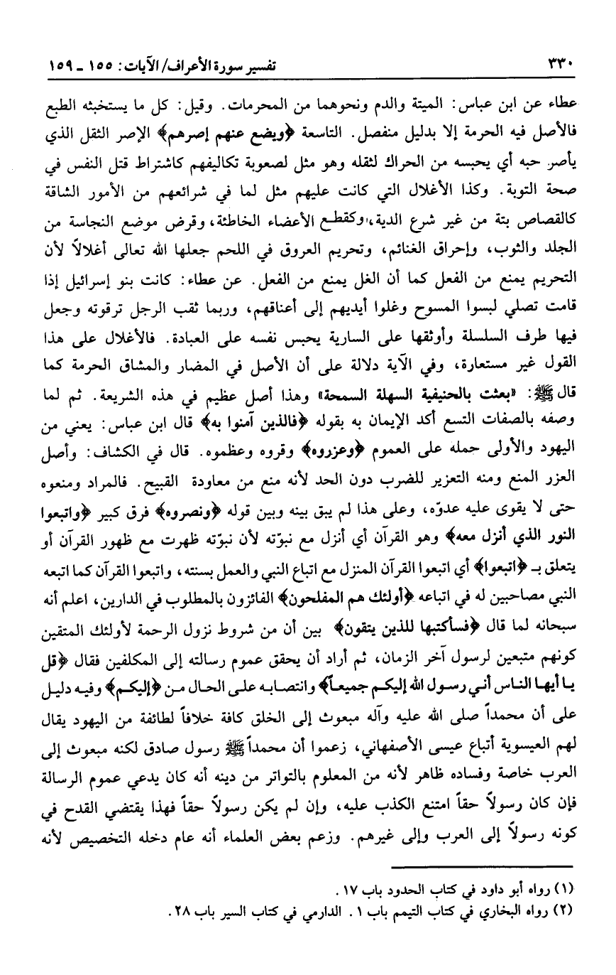 وهذا أصل عظيم في هذه الشريعة. ثم لما وصفه بالصفات التسع أكد الإيمان به بقوله فَالَّذِينَ آمَنُوا بِهِ قال ابن عباس: يعني من اليهود والأولى حمله على العموم وَعَزَّرُوهُ وقروه وعظموه. قال في الكشاف: وأصل العزر المنع ومنه التعزير للضرب دون الحد لأنه منع من معاودة القبيح. فالمراد ومنعوه حتى لا يقوى عليه عدوّه، وعلى هذا لم يبق بينه وبين قوله وَنَصَرُوهُ فرق كبير وَاتَّبَعُوا النُّورَ الَّذِي أُنْزِلَ مَعَهُ وهو القرآن أي أنزل مع نبوّته لأن نبوّته ظهرت مع ظهور القرآن أو يتعلق ب اتَّبَعُوا أي اتبعوا القرآن المنزل مع اتباع النبي والعمل بسنته، واتبعوا القرآن كما اتبعه النبي مصاحبين له في اتباعه أُولئِكَ هُمُ الْمُفْلِحُونَ الفائزون بالمطلوب في الدارين، اعلم أنه سبحانه لما قال فَسَأَكْتُبُها لِلَّذِينَ يَتَّقُونَ بين أن من شروط نزول الرحمة لأولئك المتقين كونهم متبعين لرسول آخر الزمان، ثم أراد أن يحقق عموم رسالته إلى المكلفين فقال قُلْ يا أَيُّهَا النَّاسُ إِنِّي رَسُولُ اللَّهِ إِلَيْكُمْ جَمِيعاً وانتصابه على الحال من إِلَيْكُمْ وفيه دليل على أن محمدا صلى الله عليه وآله مبعوث إلى الخلق كافة خلافا لطائفة من اليهود يقال لهم العيسوية أتباع عيسى الأصفهاني، زعموا أن محمدا صلى الله عليه وسلم رسول صادق لكنه مبعوث إلى العرب خاصة وفساده ظاهر لأنه من المعلوم بالتواتر من دينه أنه كان يدعي عموم الرسالة فإن كان رسولا حقا امتنع الكذب عليه، وإن لم يكن رسولا حقا فهذا يقتضي القدح في كونه رسولا إلى العرب وإلى غيرهم. وزعم بعض العلماء أنه عام دخله التخصيص لأنه