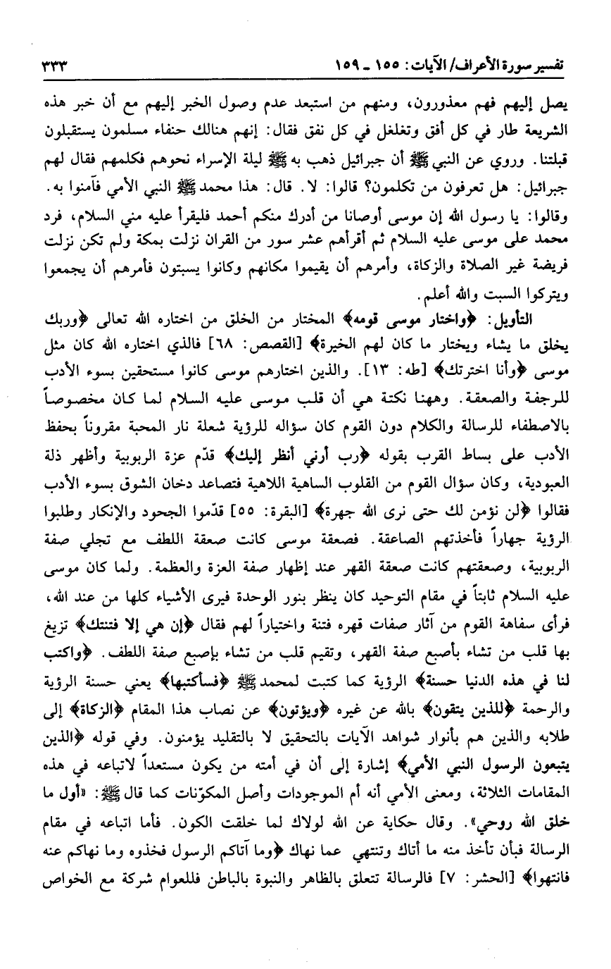 وَاخْتارَ مُوسى قَوْمَهُ المختار من الخلق من اختاره الله تعالى وَرَبُّكَ يَخْلُقُ ما يَشاءُ وَيَخْتارُ ما كانَ لَهُمُ الْخِيَرَةُ [القصص: 68] فالذي اختاره الله كان مثل موسى وَأَنَا اخْتَرْتُكَ [طه: 13] . والذين اختارهم موسى كانوا مستحقين بسوء الأدب للرجفة والصعقة. وهاهنا نكتة هي أن قلب موسى عليه السلام لما كان مخصوصا بالاصطفاء للرسالة والكلام دون القوم كان سؤاله للرؤية شعلة نار المحبة مقرونا بحفظ الأدب على بساط القرب بقوله رَبِّ أَرِنِي أَنْظُرْ إِلَيْكَ قدّم عزة الربوبية وأظهر ذلة العبودية، وكان سؤال القوم من القلوب الساهية اللاهية فتصاعد دخان الشوق بسوء الأدب فقالوا لَنْ نُؤْمِنَ لَكَ حَتَّى نَرَى اللَّهَ جَهْرَةً [البقرة: 55] قدّموا الجحود والإنكار وطلبوا الرؤية جهارا فأخذتهم الصاعقة. فصعقة موسى كانت صعقة اللطف مع تجلي صفة الربوبية، وصعقتهم كانت صعقة القهر عند إظهار صفة العزة والعظمة. ولما كان موسى عليه السلام ثابتا في مقام التوحيد كان ينظر بنور الوحدة فيرى الأشياء كلها من عند الله، فرأى سفاهة القوم من آثار صفات قهره فتنة واختيارا لهم فقال إِنْ هِيَ إِلَّا فِتْنَتُكَ تزيغ بها قلب من تشاء بأصبع صفة القهر، وتقيم قلب من تشاء بإصبع صفة اللطف. وَاكْتُبْ لَنا فِي هذِهِ الدُّنْيا حَسَنَةً الرؤية كما كتبت لمحمد صلى الله عليه وسلم فَسَأَكْتُبُها يعني حسنة الرؤية والرحمة لِلَّذِينَ يَتَّقُونَ بالله عن غيره وَيُؤْتُونَ عن نصاب هذا المقام الزَّكاةَ إلى طلابه والذين هم بأنوار شواهد الآيات بالتحقيق لا بالتقليد يؤمنون. وفي قوله الَّذِينَ يَتَّبِعُونَ الرَّسُولَ النَّبِيَّ الْأُمِّيَّ إشارة إلى أن في أمته من يكون مستعدا لاتباعه في هذه المقامات الثلاثة، ومعنى الأمي أنه أم الموجودات وأصل المكوّنات كما