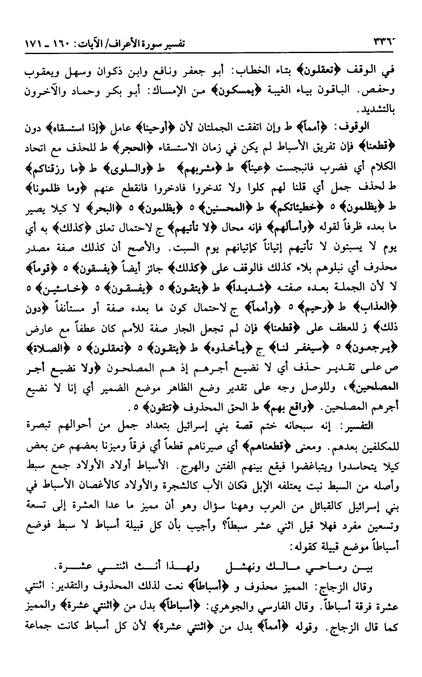 أُمَماً ط وإن اتفقت الجملتان لأن أَوْحَيْنا عامل إِذِ اسْتَسْقاهُ دون قَطَّعْناهُمُ فإن تفريق الأسباط لم يكن في زمان الاستسقاء الْحَجَرَ ط للحذف مع اتحاد الكلام أي فضرب فانبجست عَيْناً ط مَشْرَبَهُمْ ط وَالسَّلْوى ط ما رَزَقْناكُمْ ط لحذف جمل أي قلنا لهم كلوا ولا تدخروا فادخروا فانقطع عنهم وَما ظَلَمُونا ط يَظْلِمُونَ هـ خَطِيئاتِكُمْ ط الْمُحْسِنِينَ هـ يَظْلِمُونَ هـ الْبَحْرِ لا كيلا يصير ما بعده ظرفا لقوله وَسْئَلْهُمْ فإنه محال لا تَأْتِيهِمْ ج لاحتمال تعلق كَذلِكَ به أي يوم لا يسبتون لا تأتيهم إتيانا كإتيانهم يوم السبت. والأصح أن كذلك صفة مصدر محذوف أي نبلوهم بلاء كذلك فالوقف على كَذلِكَ جائز أيضا يَفْسُقُونَ هـ قَوْماً لا لأن الجملة بعده صفته شَدِيداً ط يَتَّقُونَ هـ يَفْسُقُونَ هـ خاسِئِينَ هـ الْعَذابِ ط رَحِيمٌ هـ وأمما ج لاحتمال كون ما بعده صفة أو مستأنفا دُونَ ذلِكَ ز للعطف على قَطَّعْناهُمْ فإن لم تجعل الجار صفة للأمم كان عطفا مع عارض يَرْجِعُونَ هـ سَيُغْفَرُ لَنا ج يَأْخُذُوهُ ط يَتَّقُونَ هـ تَعْقِلُونَ هـ الصَّلاةَ ص على تقدير حذف أي لا نضيع أجرهم إذ هم المصلحون ولا نُضِيعُ أَجْرَ الْمُصْلِحِينَ، وللوصل وجه على تقدير وضع الظاهر موضع الضمير أي إنا لا نضيع أجرهم المصلحين. واقِعٌ بِهِمْ ط الحق المحذوف تَتَّقُونَ هـ.