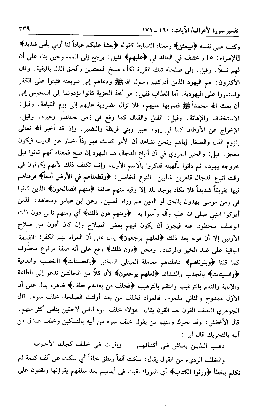 الإخراج عن الأوطان كما في يهود خيبر وبني قريظة والنضير. وإذ قد أخبر الله تعالى بلزوم الذل والصغار إياهم ونحن نشاهد أن الأمر كذلك فهو إذا إخبار عن الغيب فيكون معجز. قيل: والخبر المروي في أن أتباع الدجال هم اليهود إن صح فمعناه أنهم كانوا قبل خروجه يهود، ثم دانوا بآلهيته فذكروا بالاسم الأول، وإنما تكلف ذلك لأنهم يكونون في وقت اتباع الدجال قاهرين غالبين. النوع الخامس: وَقَطَّعْناهُمْ فِي الْأَرْضِ أُمَماً فرقناهم فيها تفريقا شديدا فلا يكاد يوجد بلد إلا وفيه منهم طائفة مِنْهُمُ الصَّالِحُونَ الذين كانوا في زمن موسى يهدون بالحق أو الذين هم وراء الصين. وعن ابن عباس ومجاهد: الذين أدركوا النبي صلى الله عليه وآله وآمنوا به. وَمِنْهُمْ دُونَ ذلِكَ أي ومنهم ناس دون ذلك الوصف منحطون عنه فيجوز أن يكون فيهم بعض الصلاح وإن كان أدون من صلاح الأولين إلا أن قوله بعد ذلك لَعَلَّهُمْ يَرْجِعُونَ يدل على أن المراد بهم الكفرة الفسقة الباقية على ضد الخير والرشاد. ومحل دُونَ ذلِكَ رفع على أنه صفة مرفوع محذوف كما قلنا وَبَلَوْناهُمْ عاملناهم معاملة المبتلى المختبر بِالْحَسَناتِ الخصب والعافية وَالسَّيِّئاتِ بالجدب والشدائد لَعَلَّهُمْ يَرْجِعُونَ لأن كلا من الحالتين تدعو إلى الطاعة والإنابة والنعم بالترغيب والنقم بالترهيب فَخَلَفَ مِنْ بَعْدِهِمْ خَلْفٌ ظاهره يدل على أن الأوّل ممدوح والثاني مذموم. فالمراد فخلف من بعد أولئك الصلحاء خلف سوء. قال الجوهري الخلف القرن بعد القرن يقال: هؤلاء خلف سوء لناس لاحقين بناس أكثر منهم.