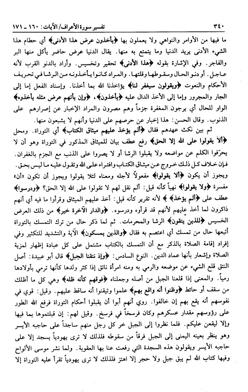 ويجوز أن يكون أَنْ لا يَقُولُوا مفعولا لأجله ومعناه لئلا يقولوا ويجوز أن تكون «أن» مفسرة ولا يَقُولُوا نهيا كأنه قيل: ألم نقل لهم لا تقولوا على الله إلا الحق؟ وَدَرَسُوا عطف على أَلَمْ يُؤْخَذْ لأنه تقرير كأنه قيل: أخذ عليهم الميثاق وقرأوا ما فيه أي أنهم ذاكرون لما أخذ عليهم لأنهم قد قرأوه ودرسوه. وَالدَّارُ الْآخِرَةُ خَيْرٌ من ذلك العرض الخسيس لِلَّذِينَ يَتَّقُونَ الرشا والمحرمات. ثم لما ذكر حال من ترك التمسك بالتوراة أتبعها حال من تمسك أي اعتصم به فقال وَالَّذِينَ يُمَسِّكُونَ الآية والتشديد للتكثير وفي إفراد إقامة الصلاة بالذكر مع أن التمسك بالكتاب مشتمل على كل عبادة إظهار لمزية الصلاة وإشعار بأنها عماد الدين. النوع السادس: وَإِذْ نَتَقْنَا الْجَبَلَ قال أبو عبيدة: أصل النتق قلع الشيء عن موضعه والرمي به ومنه امرأة ناتق إذا كثر ولدها كأنها ترمي بأولادها رميا. والمعنى إذا قلعنا الجبل من أصله وجعلناه فَوْقَهُمْ كَأَنَّهُ ظُلَّةٌ وهي كل ما أظلك من سقف أو حائط وَظَنُّوا أَنَّهُ واقِعٌ بِهِمْ علموا وتيقنوا أنه ساقط عليهم. وقيل: قوي في نفوسهم أنه يقع بهم إن خالفوا.