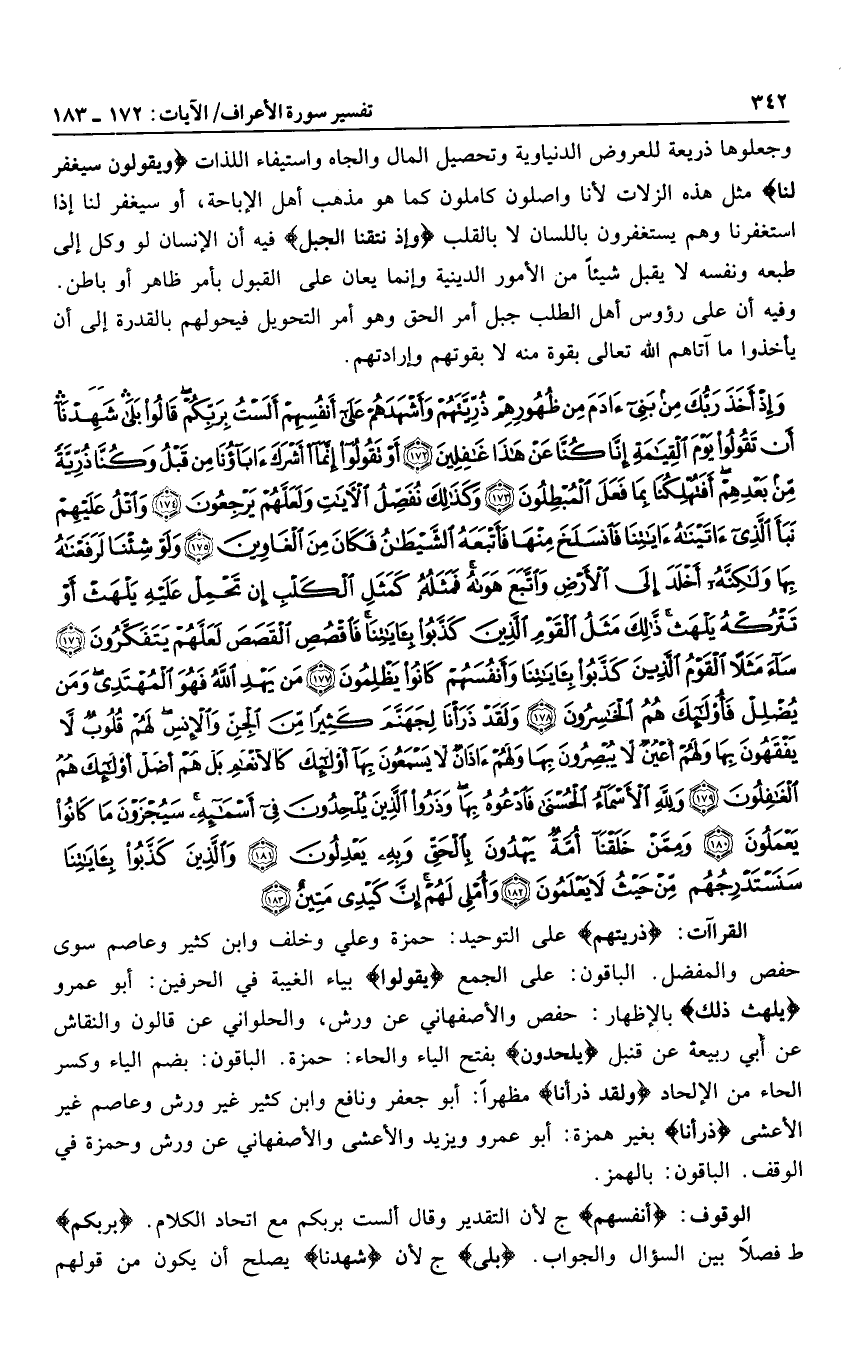 ذُرِّيَّتَهُمْ على التوحيد: حمزة وعلي وخلف وابن كثير وعاصم سوى حفص والمفضل. الباقون: على الجمع يقولوا بياء الغيبة في الحرفين: أبو عمرو يَلْهَثْ ذلِكَ بالإظهار: حفص والأصفهاني عن ورش، والحلواني عن قالون والنقاش عن أبي ربيعة عن قنبل يُلْحِدُونَ بفتح الياء والحاء: حمزة. الباقون: بضم الياء وكسر الحاء من الإلحاد وَلَقَدْ ذَرَأْنا مظهرا: أبو جعفر ونافع وابن كثير غير ورش وعاصم غير الأعشى ذَرَأْنا بغير همزة: أبو عمرو ويزيد والأعشى والأصفهاني عن ورش وحمزة في الوقف. الباقون: بالهمز.