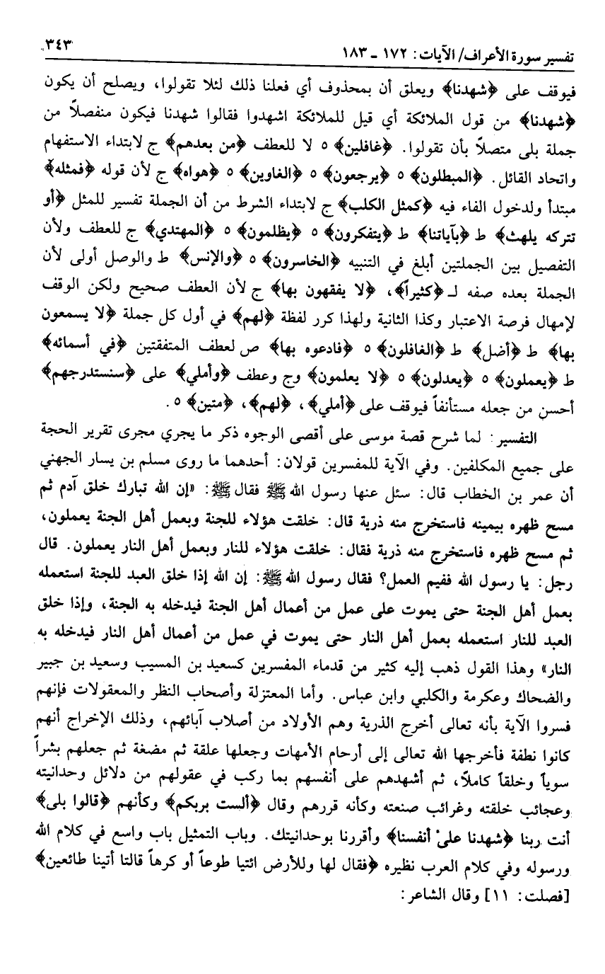 وهذا القول ذهب إليه كثير من قدماء المفسرين كسعيد بن المسيب وسعيد بن جبير والضحاك وعكرمة والكلبي وابن عباس. وأما المعتزلة وأصحاب النظر والمعقولات فإنهم فسروا الآية بأنه تعالى أخرج الذرية وهم الأولاد من أصلاب آبائهم، وذلك الإخراج أنهم كانوا نطفة فأخرجها الله تعالى إلى أرحام الأمهات وجعلها علقة ثم مضغة ثم جعلهم بشرا سويا وخلقا كاملا، ثم أشهدهم على أنفسهم بما ركب في عقولهم من دلائل وحدانيته وعجائب خلقته وغرائب صنعته وكأنه قررهم وقال أَلَسْتُ بِرَبِّكُمْ وكأنهم قالُوا بَلى أنت ربناهِدْنا عَلى أَنْفُسِنا