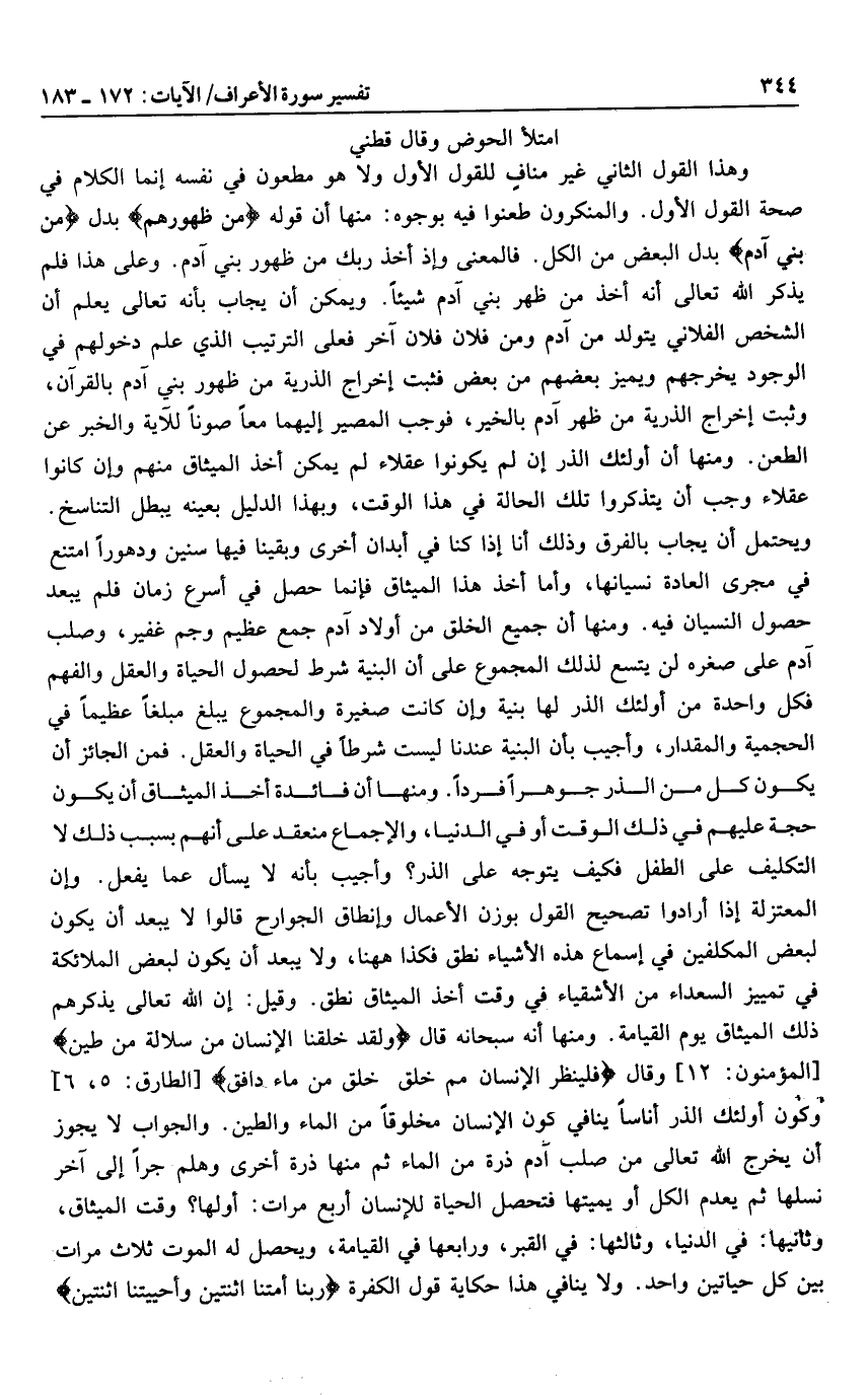امتلأ الحوض وقال قطني وهذا القول الثاني غير مناف للقول الأول ولا هو مطعون في نفسه إنما الكلام في صحة القول الأول. والمنكرون طعنوا فيه بوجوه: منها أن قوله مِنْ ظُهُورِهِمْ بدل مِنْ بَنِي آدَمَ بدل البعض من الكل. فالمعنى وإذ أخذ ربك من ظهور بني آدم. وعلى هذا فلم يذكر الله تعالى أنه أخذ من ظهر بني آدم شيئا. ويمكن أن يجاب بأنه تعالى يعلم أن الشخص الفلاني يتولد من آدم ومن فلان فلان آخر فعلى الترتيب الذي علم دخولهم في الوجود يخرجهم ويميز بعضهم من بعض فثبت إخراج الذرية من ظهور بني آدم بالقرآن، وثبت إخراج الذرية من ظهر آدم بالخير، فوجب المصير إليهما معا صونا للآية والخبر عن الطعن. ومنها أن أولئك الذر إن لم يكونوا عقلاء لم يمكن أخذ الميثاق منهم وإن كانوا عقلاء وجب أن يتذكروا تلك الحالة في هذا الوقت، وبهذا الدليل بعينه يبطل التناسخ.