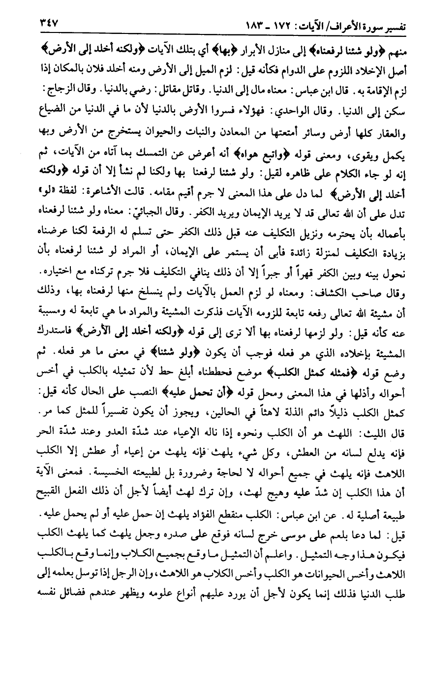 سكن إلى الدنيا. وقال الواحدي: فهؤلاء فسروا الأرض بالدنيا لأن ما في الدنيا من الضياع والعقار كلها أرض وسائر أمتعتها من المعادن والنبات والحيوان يستخرج من الأرض وبها يكمل ويقوى، ومعنى قوله وَاتَّبَعَ هَواهُ أنه أعرض عن التمسك بما آتاه من الآيات، ثم إنه لو جاء الكلام على ظاهره لقيل: ولو شئنا لرفعنا بها ولكنا لم نشأ إلا أن قوله وَلكِنَّهُ أَخْلَدَ إِلَى الْأَرْضِ لما دل على هذا المعنى لا جرم أقيم مقامه. قالت الأشاعرة: لفظة «لو» تدل على أن الله تعالى قد لا يريد الإيمان ويريد الكفر. وقال الجبائيّ: معناه ولو شئنا لرفعناه بأعماله بأن يحترمه ونزيل التكليف عنه قبل ذلك الكفر حتى تسلم له الرفعة لكنا عرضناه بزيادة التكليف لمنزلة زائدة فأبى أن يستمر على الإيمان، أو المراد لو شئنا لرفعناه بأن نحول بينه وبين الكفر قهرا أو جبرا إلا أن ذلك ينافي التكليف فلا جرم تركناه مع اختياره.