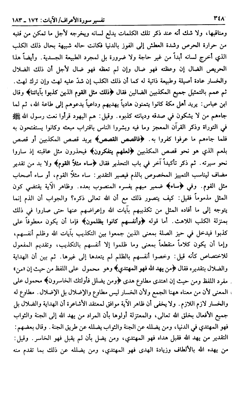 ومناقبها، ولا شك أنه عند ذكر تلك الكلمات يدلع لسانه ويخرجه لأجل ما تمكن من قلبه من حرارة الحرص وشدة العطش إلى الفوز بالدنيا فكانت حاله شبيهة بحال ذلك الكلب الذي أخرج لسانه أبدا من غير حاجة ولا ضرورة بل لمجرد الطبيعة الجسدية. وأيضا هذا الحريص الضال إن وعظته فهو ضال وإن لم تعظه فهو ضال لأجل أن ذلك الضلال والخسار عادة أصيلة وطبيعة ذاتية له كما أن ذلك الكلب إن شدّ عليه لهث وإن ترك لهث.