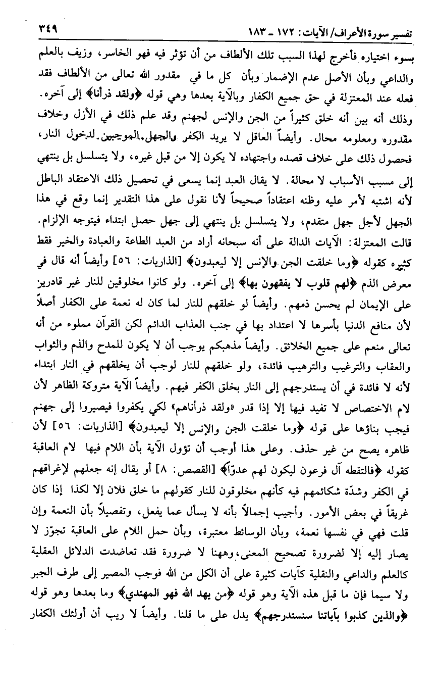 وذلك أنه بين أنه خلق كثيرا من الجن والإنس لجهنم وقد علم ذلك في الأزل وخلاف مقدوره ومعلومه محال. وأيضا العاقل لا يريد الكفر والجهل. الموجبين لدخول النار، فحصول ذلك على خلاف قصده واجتهاده لا يكون إلا من قبل غيره، ولا يتسلسل بل ينتهي إلى مسبب الأسباب لا محالة. لا يقال العبد إنما يسعى في تحصيل ذلك الاعتقاد الباطل لأنه اشتبه لأمر عليه وظنه اعتقادا صحيحا لأنا نقول على هذا التقدير إنما وقع في هذا الجهل لأجل جهل متقدم، ولا يتسلسل بل ينتهي إلى جهل حصل ابتداء فيتوجه الإلزام.