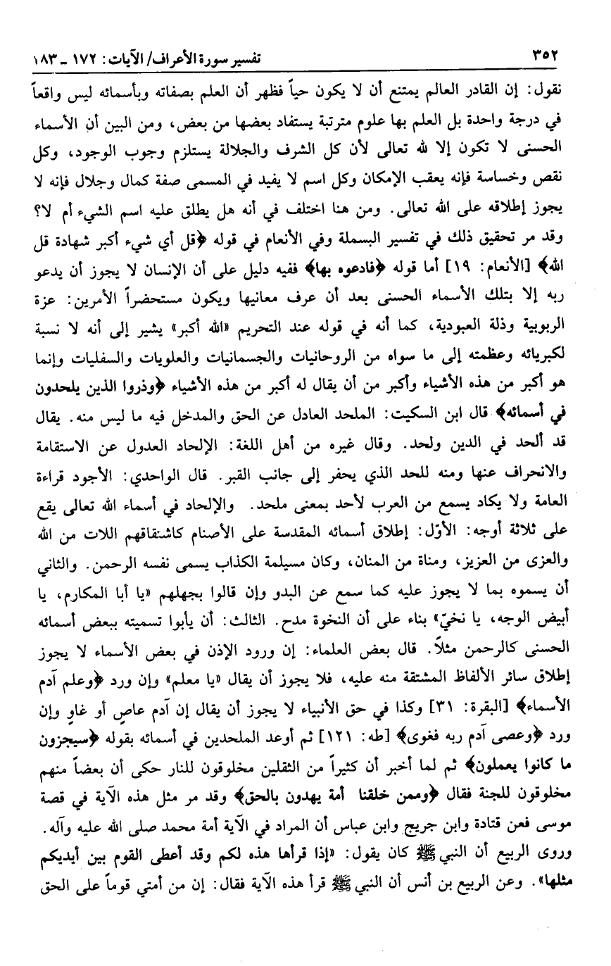 وقد مر تحقيق ذلك في تفسير البسملة وفي الأنعام في قوله قُلْ أَيُّ شَيْءٍ أَكْبَرُ شَهادَةً قُلِ اللَّهُ [الأنعام: 19] أما قوله فَادْعُوهُ بِها ففيه دليل على أن الإنسان لا يجوز أن يدعو ربه إلا بتلك الأسماء الحسنى بعد أن عرف معانيها ويكون مستحضرا الأمرين: عزة الربوبية وذلة العبودية، كما أنه في قوله عند التحريم «الله أكبر» يشير إلى أنه لا نسبة لكبريائه وعظمته إلى ما سواه من الروحانيات والجسمانيات والعلويات والسفليات وإنما هو أكبر من هذه الأشياء وأكبر من أن يقال له أكبر من هذه الأشياء وَذَرُوا الَّذِينَ يُلْحِدُونَ فِي أَسْمائِهِ قال ابن السكيت: الملحد العادل عن الحق والمدخل فيه ما ليس منه. يقال قد ألحد في الدين ولحد. وقال غيره من أهل اللغة: الإلحاد العدول عن الاستقامة والانحراف عنها ومنه للحد الذي يحفر إلى جانب القبر. قال الواحدي: الأجود قراءة العامة ولا يكاد يسمع من العرب لأحد بمعنى ملحد. والإلحاد في أسماء الله تعالى يقع على ثلاثة أوجه: الأوّل: إطلاق أسمائه المقدسة على الأصنام كاشتقاقهم اللات من الله والعزى من العزيز، ومناة من المنان، وكان مسيلمة الكذاب يسمى نفسه الرحمن. والثاني أن يسموه بما لا يجوز عليه كما سمع عن البدو وإن قالوا بجهلهم «يا أبا المكارم، يا أبيض الوجه، يا نخيّ» بناء على أن النخوة مدح. الثالث: أن يأبوا تسميته ببعض أسمائه الحسنى كالرحمن مثلا. قال بعض العلماء: إن ورود الإذن في بعض الأسماء لا يجوز إطلاق سائر الألفاظ المشتقة منه عليه، فلا يجوز أن يقال «يا معلم» وإن ورد وَعَلَّمَ آدَمَ الْأَسْماءَ [البقرة: 31] وكذا في حق الأنبياء لا يجوز أن يقال إن آدم عاص أو غاو وإن ورد وَعَصى آدَمُ رَبَّهُ فَغَوى [طه: 121] ثم أوعد الملحدين في أسمائه بقوله سَيُجْزَوْنَ ما كانُوا يَعْمَلُونَ ثم لما أخبر أن كثيرا من الثقلين مخلوقون للنار حكى أن بعضا منهم مخلوقون للجنة فقال وَمِمَّنْ خَلَقْنا أُمَّةٌ يَهْدُونَ بِالْحَقِّ وقد مر مثل هذه الآية في قصة موسى فعن قتادة وابن جريج وابن عباس أن المراد في الآية أمة محمد صلى الله عليه وآله.