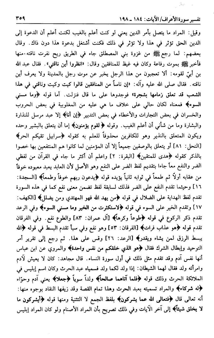 16] وحيثما تقدم النفع على الضر فذلك لسابقة لفظ تضمن معنى نفع كما في هذه السورة تقدم لفظ الهداية على الضلال في قوله مَنْ يَهْدِ اللَّهُ فَهُوَ الْمُهْتَدِي وَمَنْ يُضْلِلْ [الكهف: