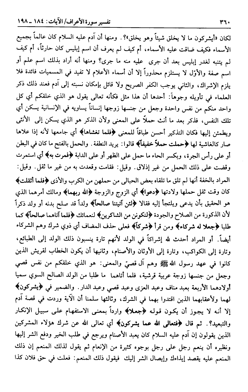 المراد بالخفة أنها لم تلق ما تلقاه بعض الحبالى من حملهن من الكرب والأذى فَلَمَّا أَثْقَلَتْ كان وقت ثقل حملها ولادتها دَعَوَا أي الزوج والزوجة اللَّهَ رَبَّهُما ومالك أمرهما الذي هو الحقيق بأن يدعى ويلتجأ إليه فقالا لَئِنْ آتَيْتَنا صالِحاً ولدا قد صلح بدنه أو ولد ذكرا لأن الذكورة من الصلاح والجودة لَنَكُونَنَّ مِنَ الشَّاكِرِينَ لنعمائك فَلَمَّا آتاهُما صالِحاً كما طلبا جَعَلا لَهُ شُرَكاءَ ومن قرأ شركا فعلى حذف المضاف أي ذوي شرك وهم الشركاء أيضا. أو المراد أحدث لله إشراكا في الولد لأنهم تارة ينسبون ذلك الولد إلى الطبائع، وتارة إلى الكواكب، وتارة إلى الأوثان والأصنام، وثانيها أن يكون الخطاب لقريش الذين كانوا في عهد رسول الله صلى الله عليه وسلم وهم آل قصيّ والمعنى: هو الذي خلقكم من نفس قصي وجعل من جنسها زوجة عربية قرشية، فلما أتاهما ما طلبا من الولد الصالح السوي سميا أولادهما الأربعة بعبد مناف وعبد العزى وعبد قصي وعبد الدار. والضمير في يُشْرِكُونَ لهما ولأعقابهما الذين اقتدوا بهما في الشرك، وثالثها سلمنا أن الآية وردت في قصة آدم إلا أنه لا يجوز أن يكون قوله جَعَلا واردا بمعنى الاستفهام على سبيل الإنكار والتبعيد؟. ثم قال فَتَعالَى اللَّهُ عَمَّا يُشْرِكُونَ أي تعالى الله عن شرك هؤلاء المشركين الذين يقولون إن آدم عليه السلام كان يعبد الأصنام ويرجع في طلب الخير ودفع الشر إليها ونظيره أن ينعم رجل على رجل بوجوه كثيرة من الإنعام ثم يقول لذلك المنعم إن ذلك المنعم عليه يقصد إيذاءك وإيصال الشر إليك فيقول ذلك المنعم: فعلت في حق فلان كذا