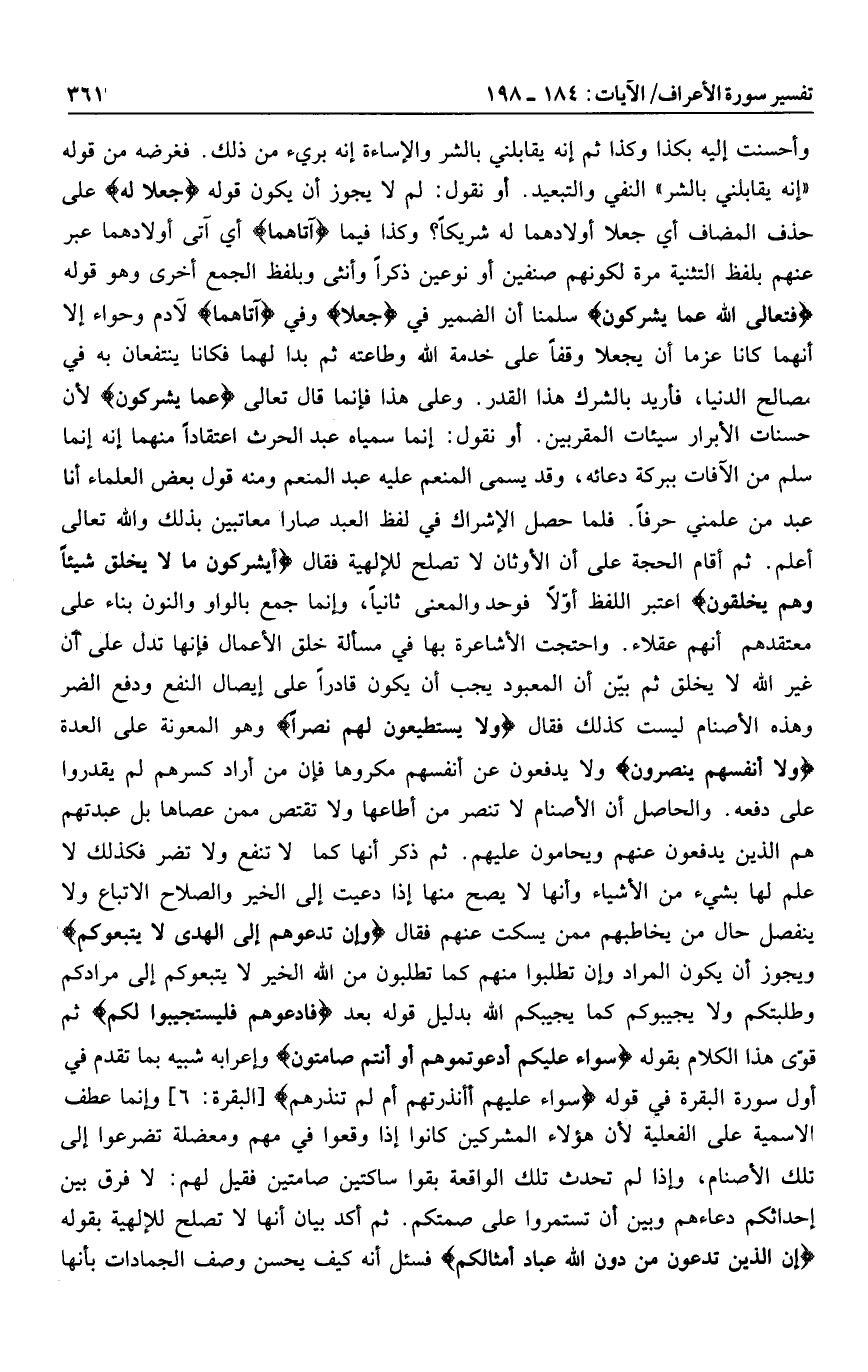 النفي والتبعيد. أو نقول: لم لا يجوز أن يكون قوله جَعَلا لَهُ على حذف المضاف أي جعلا أولادهما له شريكا؟ وكذا فيما آتاهُما أي آتى أولادهما عبر عنهم بلفظ التثنية مرة لكونهم صنفين أو نوعين ذكرا وأنثى وبلفظ الجمع أخرى وهو قوله فَتَعالَى اللَّهُ عَمَّا يُشْرِكُونَ سلمنا أن الضمير في جَعَلا وفي آتاهُما لآدم وحواء إلا أنهما كانا عزما أن يجعلا وقفا على خدمة الله وطاعته ثم بدا لهما فكانا ينتفعان به في مصالح الدنيا، فأريد بالشرك هذا القدر. وعلى هذا فإنما قال تعالى عَمَّا يُشْرِكُونَ لأن حسنات الأبرار سيئات المقربين. أو نقول: إنما سمياه عبد الحرث اعتقادا منهما إنه إنما سلم من الآفات ببركة دعائه، وقد يسمى المنعم عليه عبد المنعم ومنه قول بعض العلماء أنا عبد من علمني حرفا. فلما حصل الإشراك في لفظ العبد صارا معاتبين بذلك والله تعالى أعلم. ثم أقام الحجة على أن الأوثان لا تصلح للإلهية فقال أَيُشْرِكُونَ ما لا يَخْلُقُ شَيْئاً وَهُمْ يُخْلَقُونَ اعتبر اللفظ أوّلا فوحد والمعنى ثانيا، وإنما جمع بالواو والنون بناء على معتقدهم أنهم عقلاء. واحتجت الأشاعرة بها في مسألة خلق الأعمال فإنها تدل على أن غير الله لا يخلق ثم بيّن أن المعبود يجب أن يكون قادرا على إيصال النفع ودفع الضر وهذه الأصنام ليست كذلك فقال وَلا يَسْتَطِيعُونَ لَهُمْ نَصْراً وهو المعونة على العدة وَلا أَنْفُسَهُمْ يَنْصُرُونَ ولا يدفعون عن أنفسهم مكروها فإن من أراد كسرهم لم يقدروا على دفعه. والحاصل أن الأصنام لا تنصر من أطاعها ولا تقتص ممن عصاها بل عبدتهم هم الذين يدفعون عنهم ويحامون عليهم. ثم ذكر أنها كما لا تنفع ولا تضر فكذلك لا علم لها بشيء من الأشياء وأنها لا يصح منها إذا دعيت إلى الخير والصلاح الاتباع ولا ينفصل حال من يخاطبهم ممن يسكت عنهم فقال وَإِنْ تَدْعُوهُمْ إِلَى الْهُدى لا يَتَّبِعُوكُمْ ويجوز أن يكون المراد وإن تطلبوا منهم كما تطلبون من الله الخير لا يتبعوكم إلى مرادكم وطلبتكم ولا يجيبوكم كما يجيبكم الله بدليل قوله بعد فَادْعُوهُمْ فَلْيَسْتَجِيبُوا لَكُمْ ثم قوّى هذا الكلام بقوله سَواءٌ عَلَيْكُمْ أَدَعَوْتُمُوهُمْ أَمْ أَنْتُمْ صامِتُونَ وإعرابه شبيه بما تقدم في أول سورة البقرة في قوله سَواءٌ عَلَيْهِمْ أَأَنْذَرْتَهُمْ أَمْ لَمْ تُنْذِرْهُمْ [البقرة: 6] وإنما عطف الاسمية على الفعلية لأن هؤلاء المشركين كانوا إذا وقعوا في مهم ومعضلة تضرعوا إلى تلك الأصنام، وإذا لم تحدث تلك الواقعة بقوا ساكتين صامتين فقيل لهم: لا فرق بين إحداثكم دعاءهم وبين أن تستمروا على صمتكم. ثم أكد بيان أنها لا تصلح للإلهية بقوله إِنَّ الَّذِينَ تَدْعُونَ مِنْ دُونِ اللَّهِ عِبادٌ أَمْثالُكُمْ فسئل أنه كيف يحسن وصف الجمادات بأنها