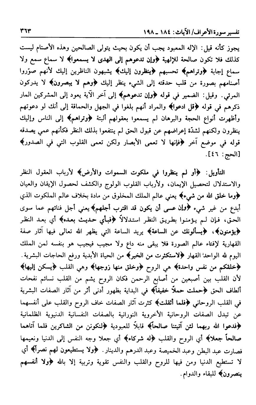 أَوَلَمْ يَنْظُرُوا فِي مَلَكُوتِ السَّماواتِ وَالْأَرْضِ لأرباب العقول النظر والاستدلال لتحصيل الإيمان، ولأرباب القلوب الولوج والكشف لحصول الإيقان والعيان وَما خَلَقَ اللَّهُ مِنْ شَيْءٍ يعني عالم الملك المخلوق من مادة بخلاف عالم الملكوت الذي أبدع من غير شيء وَأَنْ عَسى أَنْ يَكُونَ قَدِ اقْتَرَبَ أَجَلُهُمْ يعني أجل فنائهم عما سوى الحق، فإن لم يؤمنوا بطريق النظر استدلالا فَبِأَيِّ حَدِيثٍ بَعْدَهُ أي بعد النظر يُؤْمِنُونَ، يَسْئَلُونَكَ عَنِ السَّاعَةِ يريد الساعة التي يظهر الله تعالى فيها آثار صفة القهارية لإفناء عالم الصورة فلا يبقى منه داع ولا مجيب فيجيب هو بنفسه لمن الملك اليوم لله الواحد القهار لَاسْتَكْثَرْتُ مِنَ الْخَيْرِ من الحياة الأبدية ورفع الحاجات البشرية.