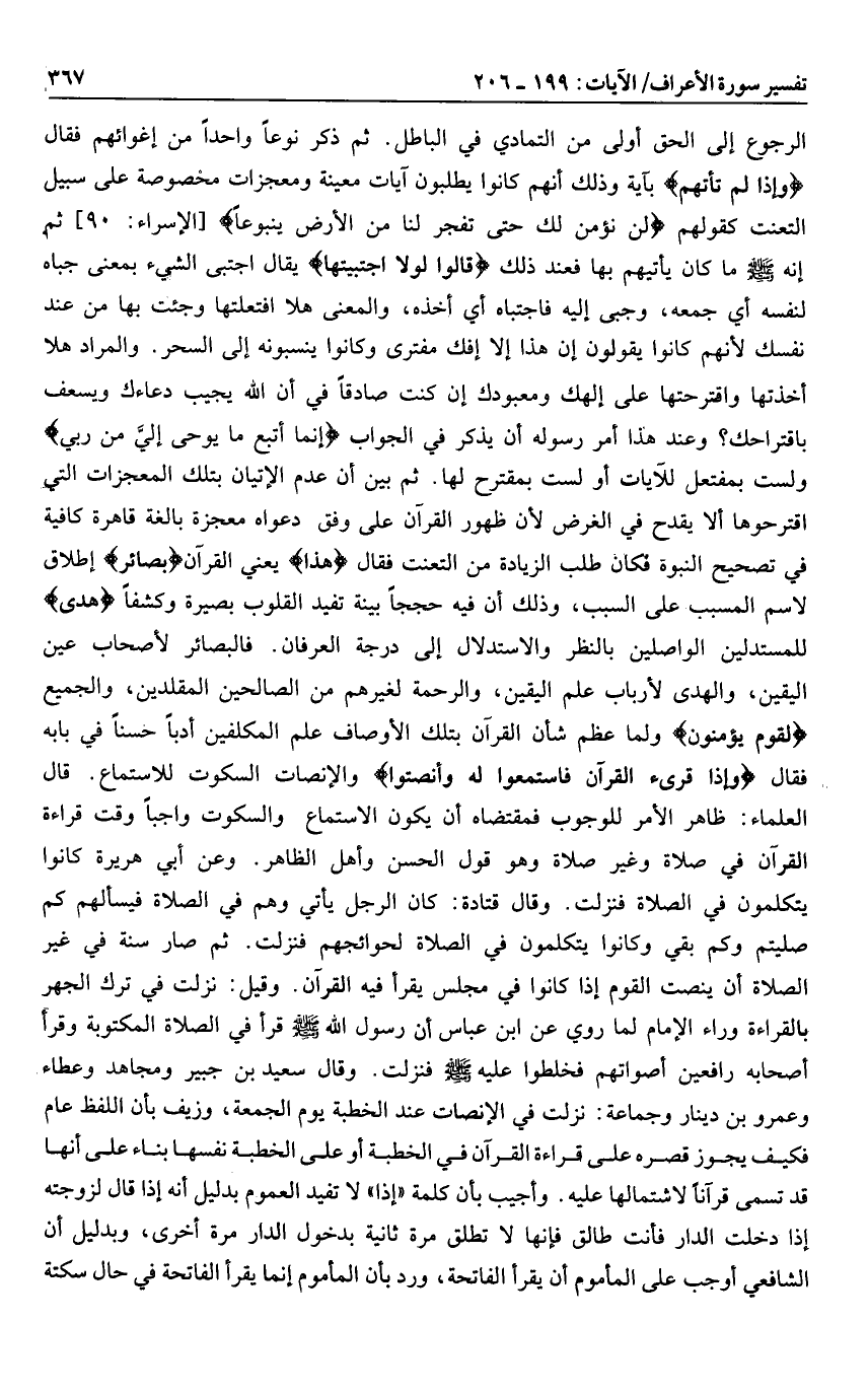 وقال سعيد بن جبير ومجاهد وعطاء وعمرو بن دينار وجماعة: نزلت في الإنصات عند الخطبة يوم الجمعة، وزيف بأن اللفظ عام فكيف يجوز قصره على قراءة القرآن في الخطبة أو على الخطبة نفسها بناء على أنها قد تسمى قرآنا لاشتمالها عليه. وأجيب بأن كلمة «إذا» لا تفيد العموم بدليل أنه إذا قال لزوجته إذا دخلت الدار فأنت طالق فإنها لا تطلق مرة ثانية بدخول الدار مرة أخرى، وبدليل أن الشافعي أوجب على المأموم أن يقرأ الفاتحة، ورد بأن المأموم إنما يقرأ الفاتحة في حال سكتة