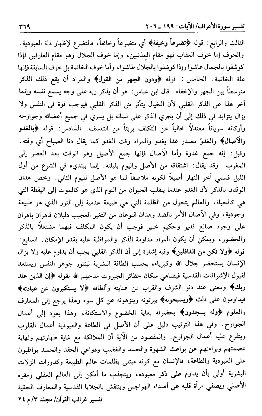 قوله وَلا تَكُنْ مِنَ الْغافِلِينَ وفيه إشارة إلى أن الذكر القلبي يجب أن يداوم عليه ولا يزال الإنسان يستحضر جلال الله وكبرياءه بحسب الطاقة البشرية ليتنور جوهر النفس ويستعد لقبول الإشراقات القدسية فيضاهي سكان حظائر الجبروت مدحهم الله بقوله إِنَّ الَّذِينَ عِنْدَ رَبِّكَ ومعنى عند دنو الشرف والقرب من عنايته وألطافه لا يَسْتَكْبِرُونَ عَنْ عِبادَتِهِ فيداومون على ذلك وَيُسَبِّحُونَهُ يبرئونه وينزهونه عن كل سوء وهذا يرجع إلى المعارف والعلوم وَلَهُ يَسْجُدُونَ بحضرته بغاية الخضوع والاستكانة، وهذا يعود إلى أعمال الجوارح. وفي هذا الترتيب دليل على أن الأصل في الطاعة والعبودية أعمال القلوب ويتفرع عليه أعمال الجوارح. والمقصود من الآية أن الملائكة مع غاية طهارتهم ونهاية عصمتهم وبراءتهم عن بواعث الشهوة والحسد والغضب ودواعي الحقد والحسد يواظبون على العبودية والطاعة، فالإنسان مع كونه مبتلى بظلمات عالم الطبيعة وكدورات الزلات البشرية أولى بأن يداوم على ذكر معبوده، وينجذب ما أمكن إلى العالم العقلي ومقره الأصلي ويصفي مرآة قلبه عن أصداء الهواجس وينتقش بالجلايا القدسية والمعارف الحقية