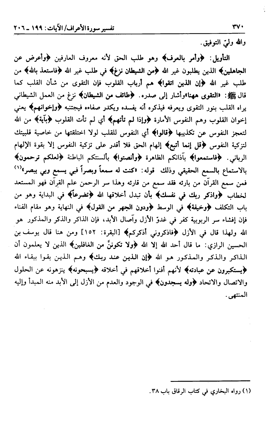 فمن سمع القرآن من بارئه فقد سمع من قارئه وهذا سر الرحمن علم القرآن فهو المستعد لخطاب وَاذْكُرْ رَبَّكَ فِي نَفْسِكَ بأن تبدل أخلاقها الله تَضَرُّعاً في البداية وهو من باب التكلف وَخِيفَةً في الوسط وَدُونَ الْجَهْرِ مِنَ الْقَوْلِ في النهاية وهو مقام الفناء فإن إفشاء سر الربوبية كفر في غدوّ الأزل وآصال الأبد، فإن الذاكر والذكر والمذكور هو الله ولهذا قال في الأزل فَاذْكُرُونِي أَذْكُرْكُمْ [البقرة: 152] ومن هنا قال يوسف بن الحسين الرازي: ما قال أحد الله إلا الله وَلا تَكُنْ مِنَ الْغافِلِينَ الذين لا يعلمون أن الذاكر والذكر والمذكور هو الله إِنَّ الَّذِينَ عِنْدَ رَبِّكَ وهم الذين بقوا ببقاء الله يَسْتَكْبِرُونَ عَنْ عِبادَتِهِ لأنهم أفنوا أخلاقهم في أخلاقه يُسَبِّحُونَهُ ينزهونه عن الحلول والاتصال والاتحاد وَلَهُ يَسْجُدُونَ في الوجود والعدم من الأزل إلى الأبد منه المبدأ وإليه المنتهى.