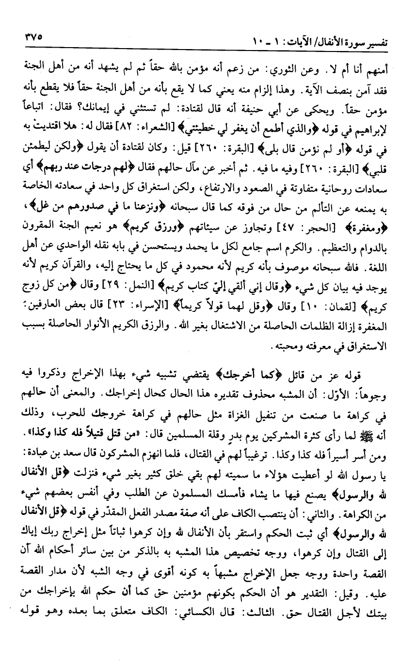 يصنع فيها ما يشاء فأمسك المسلمون عن الطلب وفي أنفس بعضهم شيء من الكراهة. والثاني: أن ينتصب الكاف على أنه صفة مصدر الفعل المقدّر في قوله قُلِ الْأَنْفالُ لِلَّهِ وَالرَّسُولِ أي ثبت الحكم واستقر بأن الأنفال لله وإن كرهوا ثباتا مثل إخراج ربك إياك إلى القتال وإن كرهوا، ووجه تخصيص هذا المشبه به بالذكر من بين سائر أحكام الله أن القصة واحدة ووجه جعل الإخراج مشبها به كونه أقوى في وجه الشبه لأن مدار القصة عليه. وقيل: التقدير هو أن الحكم بكونهم مؤمنين حق كما أن حكم الله بإخراجك من بيتك لأجل القتال حق. الثالث: قال الكسائي: الكاف متعلق بما بعده وهو قوله