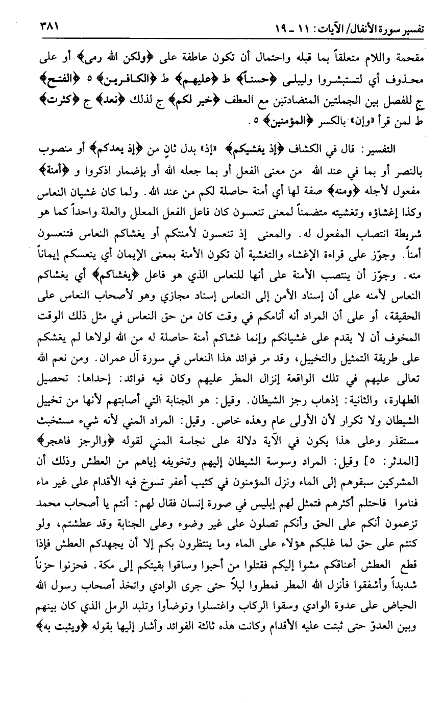 قال في الكشاف إِذْ يُغَشِّيكُمُ «إذ» بدل ثان من إِذْ يَعِدُكُمُ أو منصوب بالنصر أو بما في عند الله من معنى الفعل أو بما جعله الله أو بإضمار اذكروا وأَمَنَةً مفعول لأجله ومِنْهُ صفة لها أي أمنة حاصلة لكم من عند الله. ولما كان غشيان النعاس وكذا إغشاؤه وتغشيته متضمنا لمعنى تنعسون كان فاعل الفعل المعلل والعلة واحدا كما هو شريطة انتصاب المفعول له. والمعنى إذ تنعسون لأمنتكم أو يغشاكم النعاس فتنعسون أمنا. وجوّز على قراءة الإغشاء والتغشية أن تكون الأمنة بمعنى الإيمان أي ينعسكم إيمانا منه. وجوّز أن ينتصب الأمنة على أنها للنعاس الذي هو فاعل يُغَشِّيكُمُ أي يغشاكم النعاس لأمنه على أن إسناد الأمن إلى النعاس إسناد مجازي وهو لأصحاب النعاس على الحقيقة، أو على أن المراد أنه أنامكم في وقت كان من حق النعاس في مثل ذلك الوقت المخوف أن لا يقدم على غشيانكم وإنما غشاكم أمنة حاصلة له من الله لولاها لم يغشكم على طريقة التمثيل والتخييل، وقد مر فوائد هذا النعاس في سورة آل عمران. ومن نعم الله تعالى عليهم في تلك الواقعة إنزال المطر عليهم وكان فيه فوائد: إحداها: تحصيل الطهارة، والثانية: إذهاب رجز الشيطان. وقيل: هو الجنابة التي أصابتهم لأنها من تخييل الشيطان ولا تكرار لأن الأولى عام وهذه خاص. وقيل: المراد المني لأنه شيء مستخبث مستقذر وعلى هذا يكون في الآية دلالة على نجاسة المني لقوله وَالرُّجْزَ فَاهْجُرْ [المدثر: 5] وقيل: المراد وسوسة الشيطان إليهم وتخويفه إياهم من العطش وذلك أن المشركين سبقوهم إلى الماء ونزل المؤمنون في كثيب أعفر تسوخ فيه الأقدام على غير ماء فناموا فاحتلم أكثرهم فتمثل لهم إبليس في صورة إنسان فقال لهم: أنتم يا أصحاب محمد تزعمون أنكم على الحق وأنكم تصلون على غير وضوء وعلى الجنابة وقد عطشتم، ولو كنتم على حق لما غلبكم هؤلاء على الماء وما ينتظرون بكم إلا أن يجهدكم العطش فإذا قطع العطش أعناقكم مشوا إليكم فقتلوا من أحبوا وساقوا بقيتكم إلى مكة. فحزنوا حزنا شديدا وأشفقوا فأنزل الله المطر فمطروا ليلا حتى جرى الوادي واتخذ أصحاب رسول الله الحياض على عدوة الوادي وسقوا الركاب واغتسلوا وتوضأوا وتلبد الرمل الذي كان بينهم وبين العدوّ حتى ثبتت عليه الأقدام وكانت هذه ثالثة الفوائد وأشار إليها بقوله وَيُثَبِّتَ بِهِ