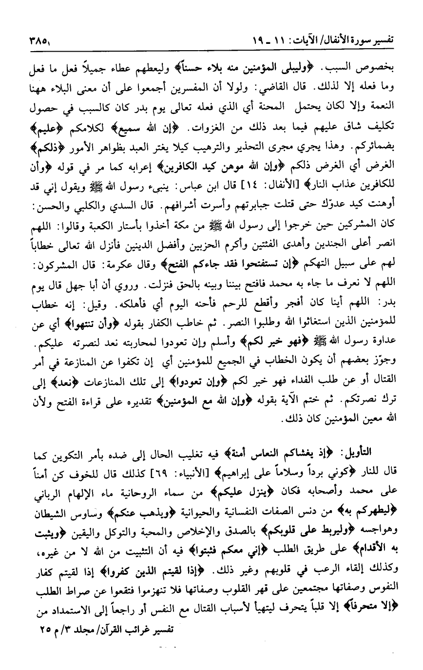إِذْ يُغَشِّيكُمُ النُّعاسَ أَمَنَةً فيه تغليب الحال إلى ضده بأمر التكوين كما قال للنار كُونِي بَرْداً وَسَلاماً عَلى إِبْراهِيمَ [الأنبياء: 69] كذلك قال للخوف كن أمنا على محمد وأصحابه فكان يُنَزِّلُ عَلَيْكُمْ من سماء الروحانية ماء الإلهام الرباني لِيُطَهِّرَكُمْ بِهِ من دنس الصفات النفسانية والحيوانية وَيُذْهِبَ عَنْكُمْ وساوس الشيطان وهواجسه وَلِيَرْبِطَ عَلى قُلُوبِكُمْ بالصدق والإخلاص والمحبة والتوكل واليقين وَيُثَبِّتَ بِهِ الْأَقْدامَ على طريق الطلب أَنِّي مَعَكُمْ فَثَبِّتُوا فيه أن التثبيت من الله لا من غيره، وكذلك إلقاء الرعب في قلوبهم وغير ذلك. إِذا لَقِيتُمُ الَّذِينَ كَفَرُوا إذا لقيتم كفار النفوس وصفاتها مجتمعين على قهر القلوب وصفاتها فلا تنهزموا فتقعوا عن صراط الطلب إِلَّا مُتَحَرِّفاً إلا قلبا يتحرف ليتهيأ لأسباب القتال مع النفس أو راجعا إلى الاستمداد من