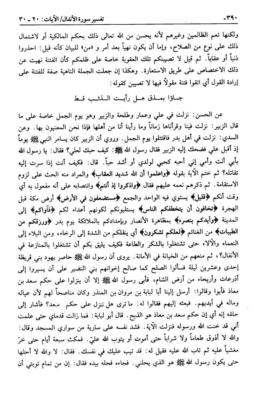 جاؤا بمذق هل رأيت الذئب قط عن الحسن: نزلت في علي وعمار وطلحة والزبير وهو يوم الجمل خاصة على ما قال الزبير: نزلت فينا وقرأناها زمانا وما رأينا أنا من أهلها فإذا نحن المعنيون بها. وعن السدي: نزلت في أهل بدر فاقتتلوا يوم الجمل.