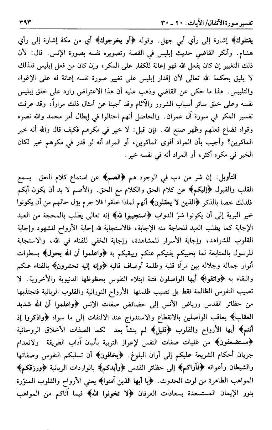إن شر من دب في الوجود هم الصُّمُّ عن استماع كلام الحق. يسمع القلب والقبول الْبُكْمُ عن كلام الحق والكلام مع الحق. والأصم لا بد أن يكون أبكم فلذلك خصا بالذكر الَّذِينَ لا يَعْقِلُونَ أنهم لماذا خلقوا فلا جرم يؤل حالهم من أن يكونوا خير البرية إلى أن يكونوا شرّ الدواب اسْتَجِيبُوا لِلَّهِ إنه تعالى يطلب بالمحجة من العبد الإجابة كما يطلب العبد للحاجة منه الإجابة، فالاستجابة لله إجابة الأرواح للشهود وإجابة القلوب للشواهد، وإجابة الأسرار للمشاهدة، وإجابة الخفي للفناء في الله، والاستجابة للرسول بالمتابعة لما يحييكم يفنيكم عنكم ويبقيكم به وَاعْلَمُوا أَنَّ اللَّهَ يَحُولُ بسطوات أنوار جماله وجلاله بين مرآة قلبه وظلمة أوصاف قالبه وَأَنَّهُ إِلَيْهِ تُحْشَرُونَ بالفناء عنكم والبقاء به وَاتَّقُوا أيها الواصلون فتنة ابتلاء النفوس بحظوظها الدنيوية والأخروية. لا تصيب النفوس الظالمة فقط بل تصيب ظلمتها الأرواح النورانية والقلوب الربانية فتجتذبها من حظائر القدس ورياض الأنس إلى حضائض صفات الإنس وَاعْلَمُوا أَنَّ اللَّهَ شَدِيدُ الْعِقابِ يعاقب الواصلين بالانقطاع والاستدراج عند الالتفات إلى ما سواه وَاذْكُرُوا إِذْ أَنْتُمْ أيها الأرواح والقلوب قَلِيلٌ لم ينشأ بعد لكما الصفات الأخلاق الروحانية مُسْتَضْعَفُونَ من غلبات صفات النفس لإعواز التربية بألبان آداب الطريقة ولانعدام جريان أحكام الشريعة عليكم إلى أوان البلوغ. يخافون أن تسلبكم النفوس وصفاتها والشيطان وأعوانه فَآواكُمْ إلى حظائر القدس وَأَيَّدَكُمْ بالواردات الربانية وَرَزَقَكُمْ المواهب الطاهرة من لوث الحدوث. يا أَيُّهَا الَّذِينَ آمَنُوا يعني الأرواح والقلوب المنوّرة بنور الإيمان المستسعدة بسعادات العرفان لا تَخُونُوا اللَّهَ فيما آتاكم من المواهب