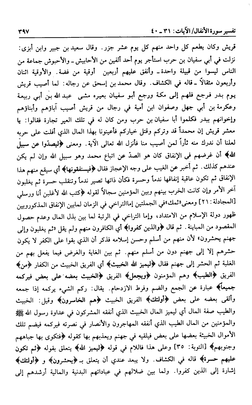 نزلت في أبي سفيان بن حرب استأجر يوم أحد ألفين من الأحابيش- والأحبوش جماعة من الناس ليسوا من قبيلة واحدة- وأنفق عليهم أربعين أوقية من فضة. والأوقية اثنان وأربعون مثقالا- قاله في الكشاف. وقال محمد بن إسحق عن رجاله: لما أصيب قريش يوم بدر فرجع فلهم إلى مكة ورجع أبو سفيان بعيره مشى عبد الله بن أبي ربيعة وعكرمة بن أبي جهل وصفوان ابن أمية في رجال من قريش أصيب آباؤهم وأبناؤهم وإخوانهم ببدر فكلموا أبا سفيان بن حرب ومن كان له في تلك العير تجارة فقالوا: يا معشر قريش إن محمدا قد وتركم وقتل خياركم فأعينونا بهذا المال الذي أفلت على حربه لعلنا أن ندرك منه ثأرا لمن أصيب منا فأنزل الله تعالى الآية. ومعنى لِيَصُدُّوا عَنْ سَبِيلِ اللَّهِ أن غرضهم فى الإنفاق كان هو الصدّ عن اتباع محمد وهو سبيل الله وإن لم يكن عندهم كذلك. ثم أخبر عن الغيب على وجه الإعجاز فقال فَسَيُنْفِقُونَها أي سيقع منهم هذا الإنفاق ثم تكون عاقبة إنفاقها ندما وحسرة فكأن ذاتها تصير ندما وتنقلب حسرة ثم يغلبون آخر الأمر وإن كانت الخرب بينهم وبين المؤمنين سجالا لقوله كَتَبَ اللَّهُ لَأَغْلِبَنَّ أَنَا وَرُسُلِي [المجادلة: 21] ومعنى «ثمك» في الجملتين إما التراخي في الزمان لما بين الإنفاق المذكور وبين ظهور دولة الإسلام من الامتداد، وإما التراخي في الرتبة لما بين بذل المال وعدم حصول المقصود من المباينة. ثم قال وَالَّذِينَ كَفَرُوا أي الكافرون منهم ولم يقل «ثم يغلبون وإلى جهنم يحشرون» لأن منهم من أسلم وحسن إسلامه فذكر أن الذي بقوا على الكفر لا يكون حشرهم إلا إلى جهنم دون من أسلم منهم. ثم بين الغاية والغرض فيما يفعل بهم من الغلبة ثم الحشر إلى جهنم فقال لِيَمِيزَ اللَّهُ الْخَبِيثَ أي الفريق الخبيث من الكفار مِنَ الفريق الطَّيِّبِ وهم المؤمنون وَيَجْعَلَ الفريق الْخَبِيثَ بَعْضَهُ عَلى بَعْضٍ فَيَرْكُمَهُ جَمِيعاً عبارة عن الجمع والضم وفرط الازدحام. يقال: ركم الشيء يركمه إذا جمعه وألقى بعضه على بعض أُولئِكَ الفريق الخبيث هُمُ الْخاسِرُونَ وقيل: الخبيث والطيب صفة المال أي ليميز المال الخبيث الذي أنفقه المشركون في عداوة رسول الله صلى الله عليه وسلم والمؤمنين من المال الطيب الذي أنفقه المهاجرون والأنصار في نصرته فيركمه فيضم تلك الأموال الخبيثة بعضها على بعض فيلقيه في جهنم ويعذبهم بها كقوله فَتُكْوى بِها جِباهُهُمْ وَجُنُوبُهُمْ [التوبة: 35] وعلى هذا فاللام في قوله لِيَمِيزَ اللَّهُ يتعلق بقوله ثُمَّ تَكُونُ عَلَيْهِمْ حَسْرَةً قاله في الكشاف. ولا يبعد عندي أن يتعلق ب يُحْشَرُونَ وأُولئِكَ إشارة إلى الذين كفروا. ولما بين ضلالهم في عباداتهم البدنية والمالية أرشدهم إلى