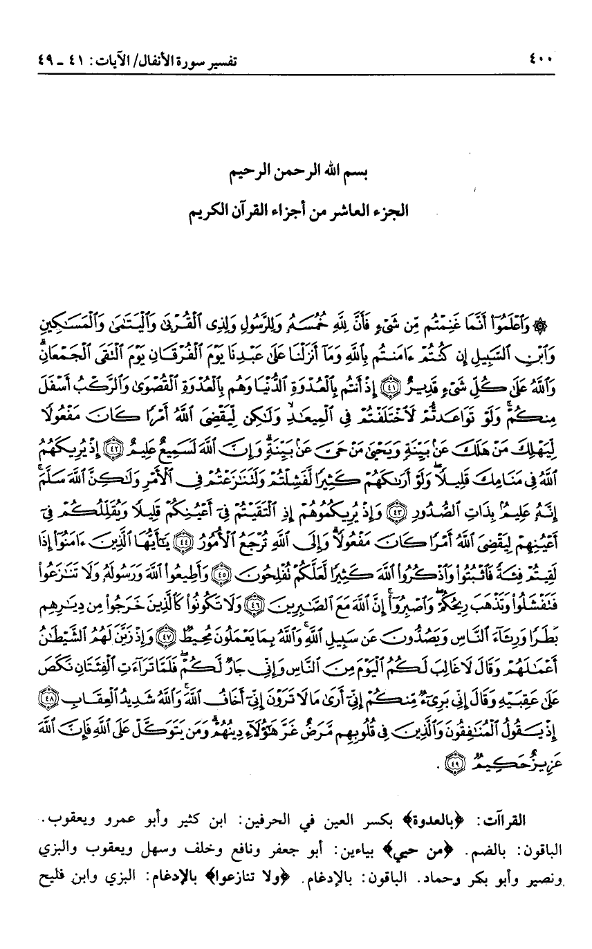وَاعْلَمُوا أَنَّما غَنِمْتُمْ مِنْ شَيْءٍ فَأَنَّ لِلَّهِ خُمُسَهُ وَلِلرَّسُولِ وَلِذِي الْقُرْبى وَالْيَتامى وَالْمَساكِينِ وَابْنِ السَّبِيلِ إِنْ كُنْتُمْ آمَنْتُمْ بِاللَّهِ وَما أَنْزَلْنا عَلى عَبْدِنا يَوْمَ الْفُرْقانِ يَوْمَ الْتَقَى الْجَمْعانِ وَاللَّهُ عَلى كُلِّ شَيْءٍ قَدِيرٌ (41) إِذْ أَنْتُمْ بِالْعُدْوَةِ الدُّنْيا وَهُمْ بِالْعُدْوَةِ الْقُصْوى وَالرَّكْبُ أَسْفَلَ مِنْكُمْ وَلَوْ تَواعَدْتُمْ لاخْتَلَفْتُمْ فِي الْمِيعادِ وَلكِنْ لِيَقْضِيَ اللَّهُ أَمْراً كانَ مَفْعُولاً لِيَهْلِكَ مَنْ هَلَكَ عَنْ بَيِّنَةٍ وَيَحْيى مَنْ حَيَّ عَنْ بَيِّنَةٍ وَإِنَّ اللَّهَ لَسَمِيعٌ عَلِيمٌ (42) إِذْ يُرِيكَهُمُ اللَّهُ فِي مَنامِكَ قَلِيلاً وَلَوْ أَراكَهُمْ كَثِيراً لَفَشِلْتُمْ وَلَتَنازَعْتُمْ فِي الْأَمْرِ وَلكِنَّ اللَّهَ سَلَّمَ إِنَّهُ عَلِيمٌ بِذاتِ الصُّدُورِ (43) وَإِذْ يُرِيكُمُوهُمْ إِذِ الْتَقَيْتُمْ فِي أَعْيُنِكُمْ قَلِيلاً وَيُقَلِّلُكُمْ فِي أَعْيُنِهِمْ لِيَقْضِيَ اللَّهُ أَمْراً كانَ مَفْعُولاً وَإِلَى اللَّهِ تُرْجَعُ الْأُمُورُ (44) يا أَيُّهَا الَّذِينَ آمَنُوا إِذا لَقِيتُمْ فِئَةً فَاثْبُتُوا وَاذْكُرُوا اللَّهَ كَثِيراً لَعَلَّكُمْ تُفْلِحُونَ (45)