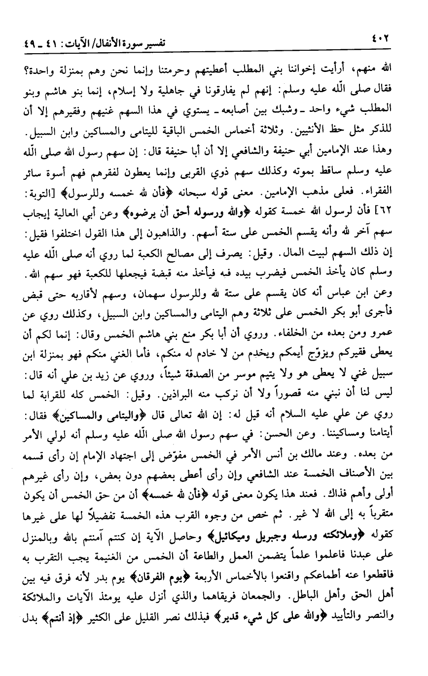 وعن الحسن: في سهم رسول الله صلى الله عليه وسلم أنه لولي الأمر من بعده. وعند مالك بن أنس الأمر في الخمس مفوّض إلى اجتهاد الإمام إن رأى قسمه بين الأصناف الخمسة عند الشافعي وإن رأى أعطى بعضهم دون بعض، وإن رأى غيرهم أولى وأهم فذاك. فعند هذا يكون معنى قوله فَأَنَّ لِلَّهِ خُمُسَهُ أن من حق الخمس أن يكون متقربا به إلى الله لا غير. ثم خص من وجوه القرب هذه الخمسة تفضيلا لها على غيرها كقوله وَمَلائِكَتِهِ وَرُسُلِهِ وَجِبْرِيلَ وَمِيكالَ وحاصل الآية إن كنتم آمنتم بالله وبالمنزل على عبدنا فاعلموا علما يتضمن العمل والطاعة أن الخمس من الغنيمة يجب التقرب به فاقطعوا عنه أطماعكم واقنعوا بالأخماس الأربعة يَوْمَ الْفُرْقانِ يوم بدر لأنه فرق فيه بين أهل الحق وأهل الباطل. والجمعان فريقاهما والذي أنزل عليه يومئذ الآيات والملائكة والنصر والتأييد وَاللَّهُ عَلى كُلِّ شَيْءٍ قَدِيرٌ فبذلك نصر القليل على الكثير إِذْ أَنْتُمْ بدل