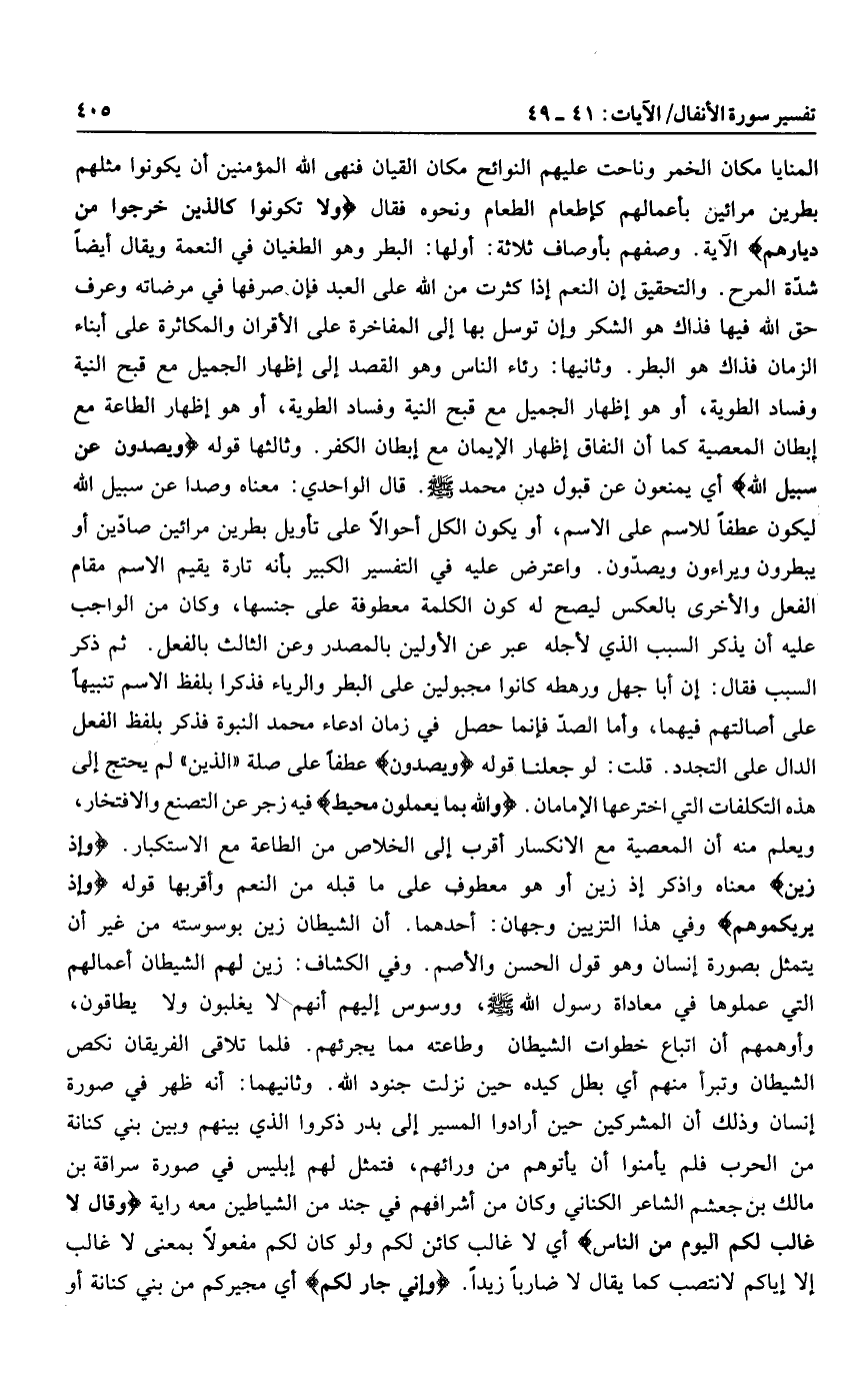 المنايا مكان الخمر وناحت عليهم النوائح مكان القيان فنهى الله المؤمنين أن يكونوا مثلهم بطرين مرائين بأعمالهم كإطعام الطعام ونحوه فقال وَلا تَكُونُوا كَالَّذِينَ خَرَجُوا مِنْ دِيارِهِمْ الآية. وصفهم بأوصاف ثلاثة: أولها: البطر وهو الطغيان في النعمة ويقال أيضا شدّة المرح. والتحقيق إن النعم إذا كثرت من الله على العبد فإن صرفها في مرضاته وعرف حق الله فيها فذاك هو الشكر وإن توسل بها إلى المفاخرة على الأقران والمكاثرة على أبناء الزمان فذاك هو البطر. وثانيها: رئاء الناس وهو القصد إلى إظهار الجميل مع قبح النية وفساد الطوية، أو هو إظهار الجميل مع قبح النية وفساد الطوية، أو هو إظهار الطاعة مع إبطان المعصية كما أن النفاق إظهار الإيمان مع إبطال الكفر. وثالثها قوله وَيَصُدُّونَ عَنْ سَبِيلِ اللَّهِ أي يمنعون عن قبول دين محمد صلى الله عليه وسلم. قال الواحدي: معناه وصدا عن سبيل الله ليكون عطفا للاسم على الاسم، أو يكون الكل أحوالا على تأويل بطرين مرائين صادّين أو يبطرون ويراءون ويصدّون. واعترض عليه في التفسير الكبير بأنه تارة يقيم الاسم مقام الفعل والأخرى بالعكس ليصح له كون الكلمة معطوفة على جنسها، وكان من الواجب عليه أن يذكر السبب الذي لأجله عبر عن الأولين بالمصدر وعن الثالث بالفعل. ثم ذكر السبب فقال: إن أبا جهل ورهطه كانوا مجبولين على البطر والرياء فذكرا بلفظ الاسم تنبيها على أصالتهم فيهما، وأما الصدّ فإنما حصل في زمان ادعاء محمد النبوة فذكر بلفظ الفعل الدال على التجدد. قلت: لو جعلنا قوله وَيَصُدُّونَ عطفا على صلة «الذين» لم يحتج إلى هذه التكلفات التي اخترعها الإمامان. وَاللَّهُ بِما يَعْمَلُونَ مُحِيطٌ فيه زجر عن التصنع والافتخار، ويعلم منه أن المعصية مع الانكسار أقرب إلى الخلاص من الطاعة مع الاستكبار. وَإِذْ زَيَّنَ معناه واذكر إذ زين أو هو معطوف على ما قبله من النعم وأقربها قوله وَإِذْ يُرِيكُمُوهُمْ وفي هذا التزيين وجهان: أحدهما. أن الشيطان زين بوسوسته من غير أن يتمثل بصورة إنسان وهو قول الحسن والأصم. وفي الكشاف: زين لهم الشيطان أعمالهم التي عملوها في معاداة رسول الله صلى الله عليه وسلم، ووسوس إليهم أنهم لا يغلبون ولا يطاقون، وأوهمهم أن اتباع خطوات الشيطان وطاعته مما يجرئهم. فلما تلاقى الفريقان نكص الشيطان وتبرأ منهم أي بطل كيده حين نزلت جنود الله. وثانيهما: أنه ظهر في صورة إنسان وذلك أن المشركين حين أرادوا المسير إلى بدر ذكروا الذي بينهم وبين بني كنانة من الحرب فلم يأمنوا أن يأتوهم من ورائهم، فتمثل لهم إبليس في صورة سراقة بن مالك بن جعشم الشاعر الكناني وكان من أشرافهم في جند من الشياطين معه راية وَقالَ لا غالِبَ لَكُمُ الْيَوْمَ مِنَ النَّاسِ أي لا غالب كائن لكم ولو كان لكم مفعولا بمعنى لا غالب إلا إياكم لانتصب كما يقال لا ضاربا زيدا. وَإِنِّي جارٌ لَكُمْ أي مجيركم من بني كنانة أو
