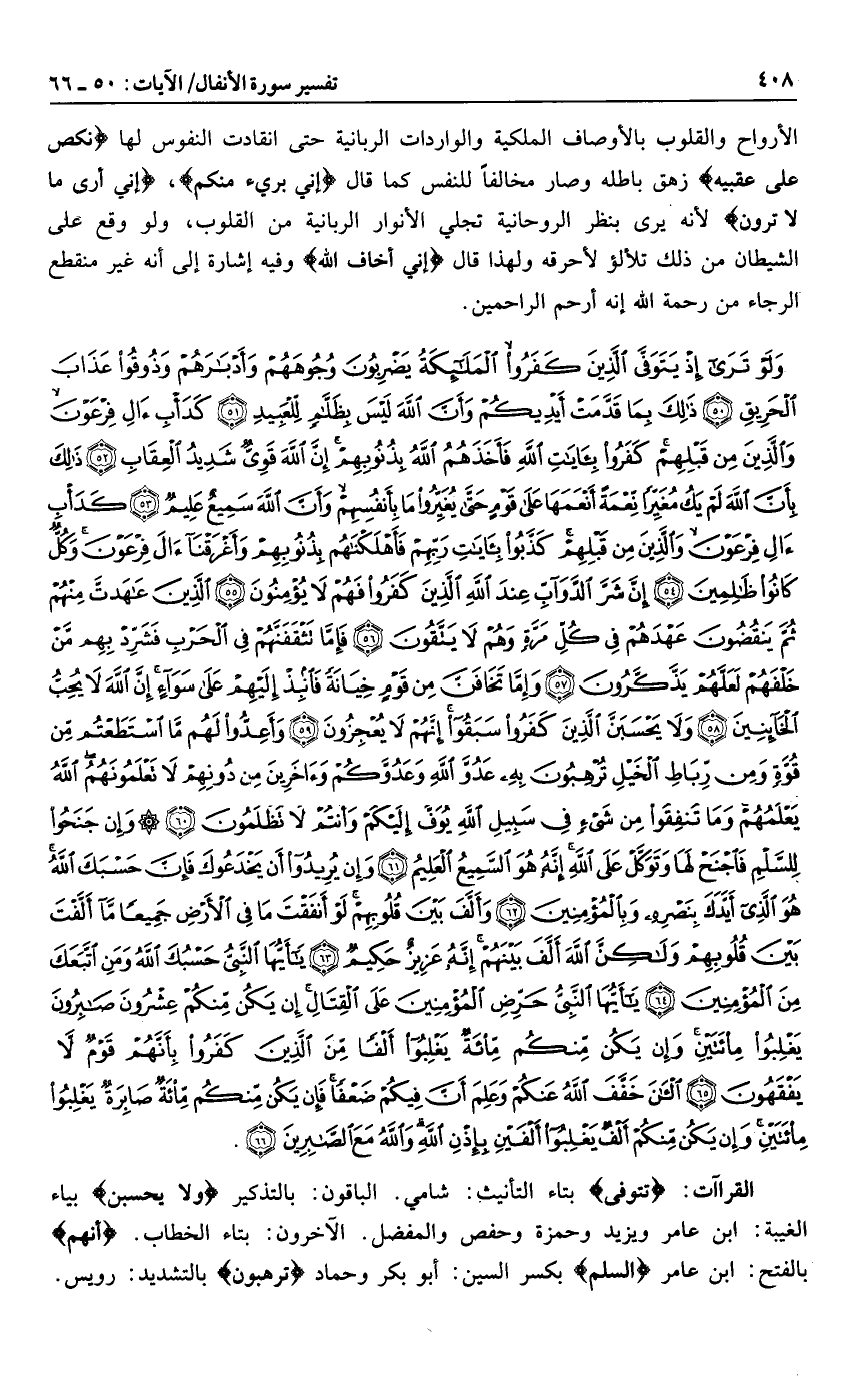 وَلَوْ تَرى إِذْ يَتَوَفَّى الَّذِينَ كَفَرُوا الْمَلائِكَةُ يَضْرِبُونَ وُجُوهَهُمْ وَأَدْبارَهُمْ وَذُوقُوا عَذابَ الْحَرِيقِ (50) ذلِكَ بِما قَدَّمَتْ أَيْدِيكُمْ وَأَنَّ اللَّهَ لَيْسَ بِظَلاَّمٍ لِلْعَبِيدِ (51) كَدَأْبِ آلِ فِرْعَوْنَ وَالَّذِينَ مِنْ قَبْلِهِمْ كَفَرُوا بِآياتِ اللَّهِ فَأَخَذَهُمُ اللَّهُ بِذُنُوبِهِمْ إِنَّ اللَّهَ قَوِيٌّ شَدِيدُ الْعِقابِ (52) ذلِكَ بِأَنَّ اللَّهَ لَمْ يَكُ مُغَيِّراً نِعْمَةً أَنْعَمَها عَلى قَوْمٍ حَتَّى يُغَيِّرُوا ما بِأَنْفُسِهِمْ وَأَنَّ اللَّهَ سَمِيعٌ عَلِيمٌ (53) كَدَأْبِ آلِ فِرْعَوْنَ وَالَّذِينَ مِنْ قَبْلِهِمْ كَذَّبُوا بِآياتِ رَبِّهِمْ فَأَهْلَكْناهُمْ بِذُنُوبِهِمْ وَأَغْرَقْنا آلَ فِرْعَوْنَ وَكُلٌّ كانُوا ظالِمِينَ (54)