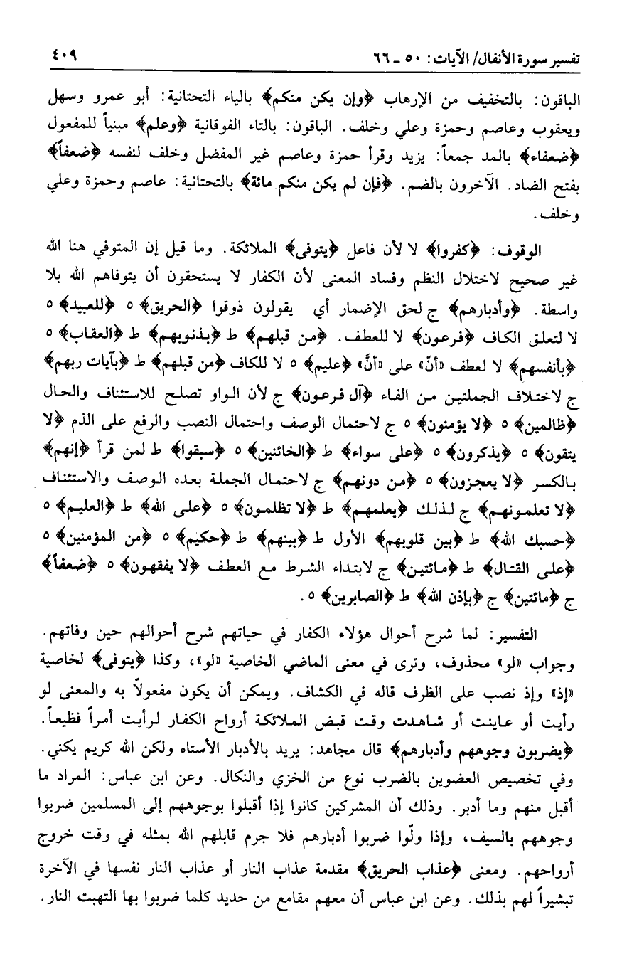 كَفَرُوا لا لأن فاعل يَتَوَفَّى الملائكة. وما قيل إن المتوفي هنا الله غير صحيح لاختلال النظم وفساد المعنى لأن الكفار لا يستحقون أن يتوفاهم الله بلا واسطة. وَأَدْبارَهُمْ ج لحق الإضمار أي يقولون ذوقوا الْحَرِيقِ هـ لِلْعَبِيدِ هـ لا لتعلق الكاف فِرْعَوْنَ لا للعطف. مِنْ قَبْلِهِمْ ط بِذُنُوبِهِمْ ط الْعِقابِ هـ بِأَنْفُسِهِمْ لا لعطف «أنّ» على «أنّ» عَلِيمٌ هـ لا للكاف مِنْ قَبْلِهِمْ ط بِآياتِ رَبِّهِمْ ج لاختلاف الجملتين من الفاء آلِ فِرْعَوْنَ ج لأن الواو تصلح للاستئناف والحال ظالِمِينَ هـ لا يُؤْمِنُونَ هـ ج لاحتمال الوصف واحتمال النصب والرفع على الذم لا يَتَّقُونَ هـ يَذَّكَّرُونَ هـ عَلى سَواءٍ ط الْخائِنِينَ هـ سَبَقُوا ط لمن قرأ إِنَّهُمْ بالكسر لا يُعْجِزُونَ هـ مِنْ دُونِهِمْ ج لاحتمال الجملة بعده الوصف والاستئناف لا تَعْلَمُونَهُمُ ج لذلك يَعْلَمُهُمْ ط لا تُظْلَمُونَ هـ عَلَى اللَّهِ ط الْعَلِيمُ هـ حَسْبَكَ اللَّهُ ط بَيْنَ قُلُوبِهِمْ الأول ط بَيْنَهُمْ ط حَكِيمٌ هـ مِنَ الْمُؤْمِنِينَ هـ عَلَى الْقِتالِ ط مِائَتَيْنِ ج لابتداء الشرط مع العطف لا يَفْقَهُونَ هـ ضَعْفاً ج مِائَتَيْنِ ج بِإِذْنِ اللَّهِ ط الصَّابِرِينَ هـ.