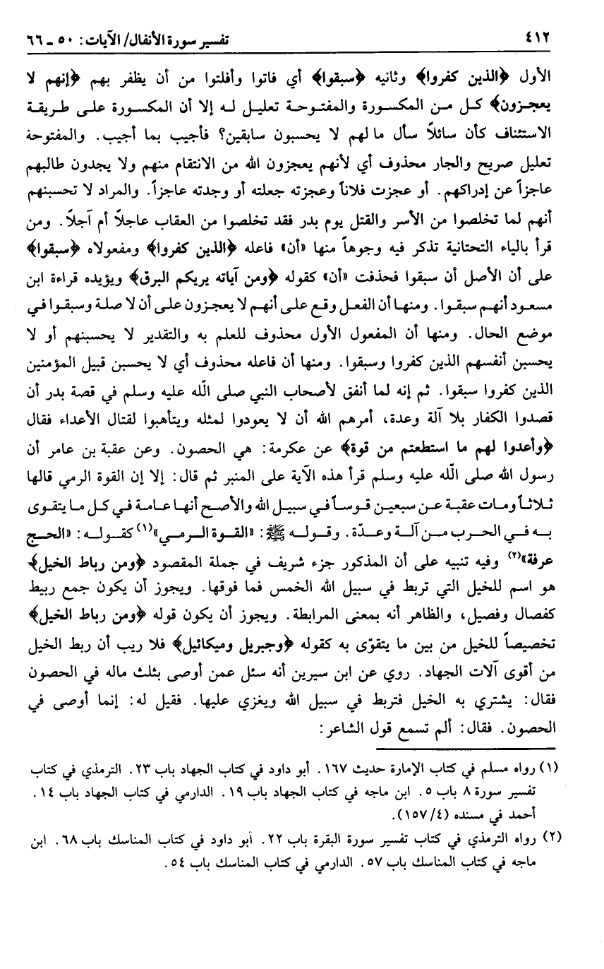 الأول الَّذِينَ كَفَرُوا وثانيه سَبَقُوا أي فاتوا وأفلتوا من أن يظفر بهم إِنَّهُمْ لا يُعْجِزُونَ كل من المكسورة والمفتوحة تعليل له إلا أن المكسورة على طريقة الاستئناف كأن سائلا سأل ما لهم لا يحسبون سابقين؟ فأجيب بما أجيب. والمفتوحة تعليل صريح والجار محذوف أي لأنهم يعجزون الله من الانتقام منهم ولا يجدون طالبهم عاجزا عن إدراكهم. أو عجزت فلانا وعجزته جعلته أو وجدته عاجزا. والمراد لا تحسبنهم أنهم لما تخلصوا من الأسر والقتل يوم بدر فقد تخلصوا من العقاب عاجلا أم آجلا. ومن قرأ بالياء التحتانية تذكر فيه وجوها منها «أن» فاعله الَّذِينَ كَفَرُوا ومفعولاه سَبَقُوا على أن الأصل أن سبقوا فحذفت «أن» كقوله وَمِنْ آياتِهِ يُرِيكُمُ الْبَرْقَ ويؤيده قراءة ابن مسعود أنهم سبقوا. ومنها أن الفعل وقع على أنهم لا يعجزون على أن لا صلة وسبقوا في موضع الحال. ومنها أن المفعول الأول محذوف للعلم به والتقدير لا يحسبنهم أو لا يحسبن أنفسهم الذين كفروا وسبقوا. ومنها أن فاعله محذوف أي لا يحسبن قبيل المؤمنين الذين كفروا سبقوا. ثم إنه لما أنفق لأصحاب النبي صلى الله عليه وسلم في قصة بدر أن قصدوا الكفار بلا آلة وعدة، أمرهم الله أن لا يعودوا لمثله ويتأهبوا لقتال الأعداء فقال وَأَعِدُّوا لَهُمْ مَا اسْتَطَعْتُمْ مِنْ قُوَّةٍ عن