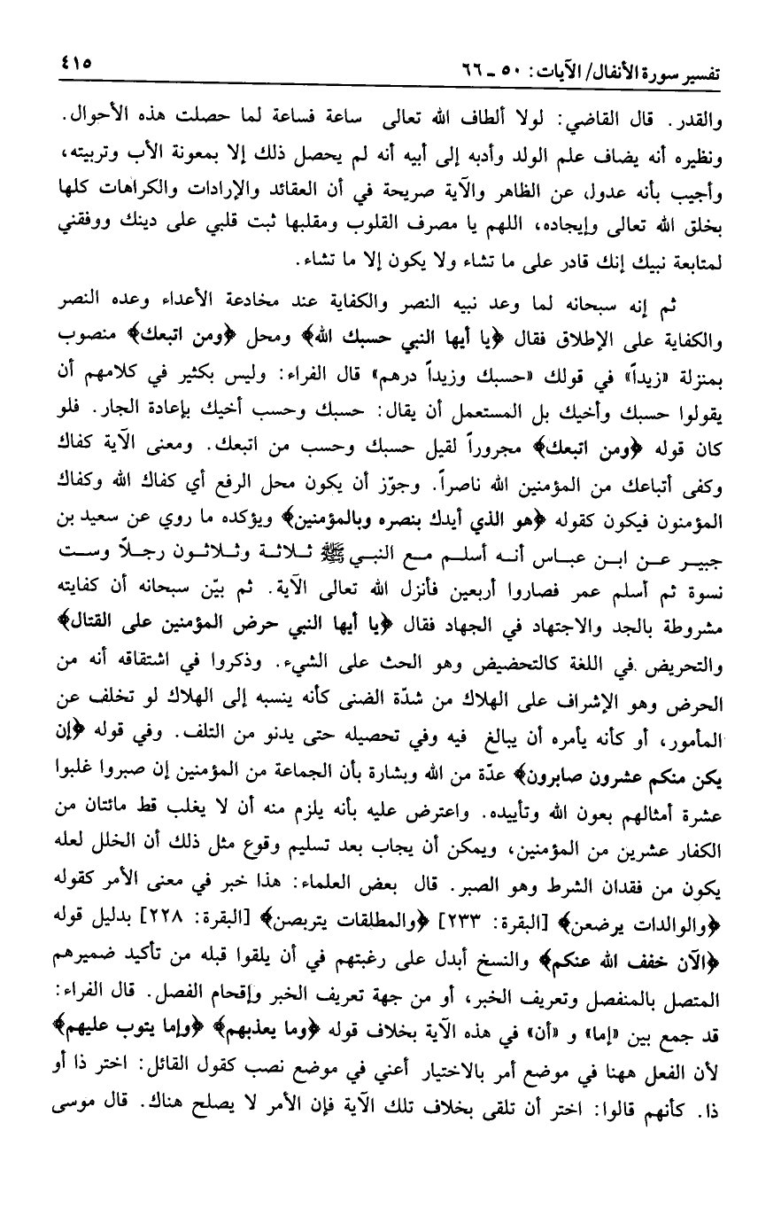 ثم إنه سبحانه لما وعد نبيه النصر والكفاية عند مخادعة الأعداء وعده النصر والكفاية على الإطلاق فقال يا أَيُّهَا النَّبِيُّ حَسْبُكَ اللَّهُ ومحل وَمَنِ اتَّبَعَكَ منصوب بمنزلة «زيدا» في قولك «حسبك وزيدا درهم» قال الفراء: وليس بكثير في كلامهم أن يقولوا حسبك وأخيك بل المستعمل أن يقال: حسبك وحسب أخيك بإعادة الجار. فلو كان قوله وَمَنِ اتَّبَعَكَ مجرورا لقيل حسبك وحسب من اتبعك. ومعنى الآية كفاك وكفى أتباعك من المؤمنين الله ناصرا. وجوّز أن يكون محل الرفع أي كفاك الله وكفاك المؤمنون فيكون كقوله هُوَ الَّذِي أَيَّدَكَ بِنَصْرِهِ وَبِالْمُؤْمِنِينَ ويؤكده ما