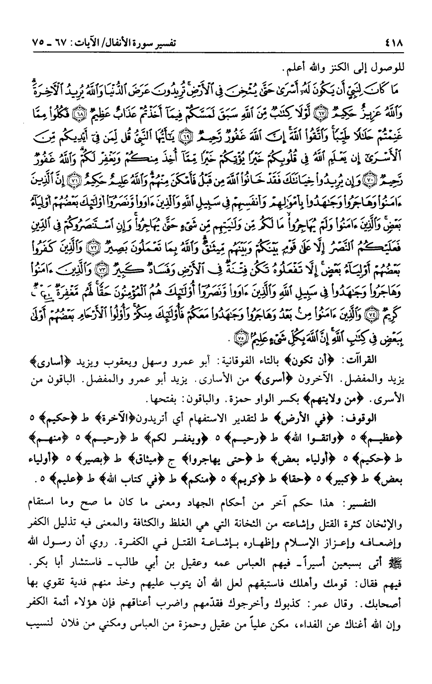 فِي الْأَرْضِ ط لتقدير الاستفهام أي أتريدون الْآخِرَةَ ط حَكِيمٌ هـ عَظِيمٌ هـ وَاتَّقُوا اللَّهَ ط رَحِيمٌ هـ وَيَغْفِرْ لَكُمْ ط رَحِيمٌ هـ مِنْهُمْ ط حَكِيمٌ هـ أَوْلِياءُ بَعْضٍ ط حَتَّى يُهاجِرُوا ج مِيثاقٌ ط بَصِيرٌ هـ أَوْلِياءُ بَعْضٍ ط كَبِيرٌ هـ حَقًّا ط كَرِيمٌ هـ مِنْكُمْ ط فِي كِتابِ اللَّهِ ط عَلِيمٌ هـ.