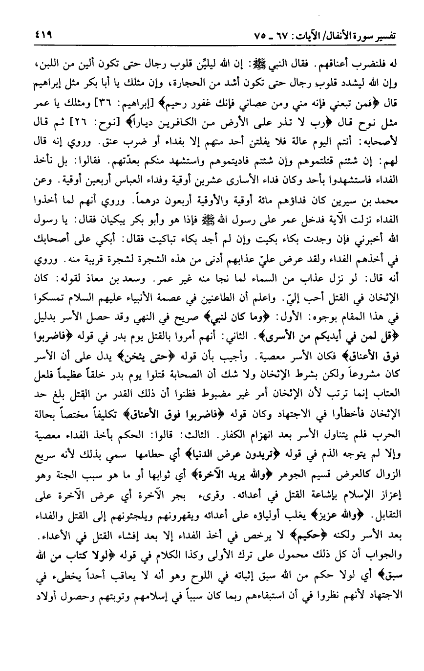 له فلنضرب أعناقهم. فقال النبي صلى الله عليه وسلم: إن الله ليليّن قلوب رجال حتى تكون ألين من اللبن، وإن الله ليشدد قلوب رجال حتى تكون أشد من الحجارة، وإن مثلك يا أبا بكر مثل إبراهيم قال فَمَنْ تَبِعَنِي فَإِنَّهُ مِنِّي وَمَنْ عَصانِي فَإِنَّكَ غَفُورٌ رَحِيمٌ [إبراهيم: 36] ومثلك يا عمر مثل نوح قال رَبِّ لا تَذَرْ عَلَى الْأَرْضِ مِنَ الْكافِرِينَ دَيَّاراً [نوح: 26] ثم قال لأصحابه: أنتم اليوم عالة فلا يفلتن أحد منهم إلا بفداء أو ضرب عنق.