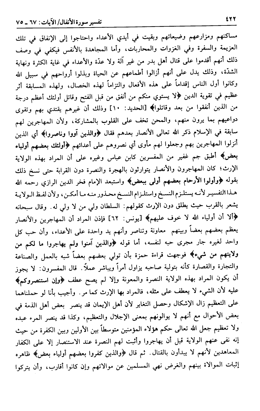 مساكنهم ومزارعهم وضيعاتهم وبقيت في أيدي الأعداء واحتاجوا إلى الإنفاق في تلك العزيمة والسفرة وفي الغزوات والمحاربات، وأما المجاهدة بالأنفس فيكفي في وصف ذلك أنهم أقدموا على قتال أهل بدر من غير آلة ولا عدّة والأعداء في غاية الكثرة ونهاية الشدّة، وذلك يدل على أنهم أزالوا أطماعهم عن الحياة وبذلوا أرواحهم في سبيل الله وكانوا أول الناس إقداما على هذه الأفعال والتزاما لهذه الخصال، ولهذه المسابقة أثر عظيم في تقوية الدين لا يَسْتَوِي مِنْكُمْ مَنْ أَنْفَقَ مِنْ قَبْلِ الْفَتْحِ وَقاتَلَ أُولئِكَ أَعْظَمُ دَرَجَةً مِنَ الَّذِينَ أَنْفَقُوا مِنْ بَعْدُ وَقاتَلُوا [الحديد: 10] وذلك أن غيرهم يقتدي بهم وتقوى دواعيهم بما يرون منهم، والمحن تخف على القلوب بالمشاركة، ولأن المهاجرين لهم سابقة في الإسلام ذكر الله تعالى الأنصار بعدهم فقال وَالَّذِينَ آوَوْا وَنَصَرُوا أي الذين أنزلوا المهاجرين بهم وجعلوا لهم مأوى أي نصروهم على أعدائهم أُولئِكَ بَعْضُهُمْ أَوْلِياءُ بَعْضٍ أطبق جم غفير من المفسرين كابن عباس وغيره على أن المراد بهذه الولاية الإرث كان المهاجرون والأنصار يتوارثون بالهجرة والنصرة دون القرابة حتى نسخ ذلك بقوله وَأُولُوا الْأَرْحامِ بَعْضُهُمْ أَوْلى بِبَعْضٍ واستبعد الإمام فخر الدين الرازي رحمه الله هذا التفسير لأنه يستلزم النسخ واستلزام النسخ محذور منه ما أمكن، ولأن لفظ الولاية يشعر بالقرب حيث يطلق دون الإرث كقولهم: السلطان ولي من لا ولي له. وقال سبحانه أَلا إِنَّ أَوْلِياءَ اللَّهِ لا خَوْفٌ عَلَيْهِمْ [يونس: 62] فإذن المراد أن المهاجرين والأنصار يعظم بعضهم بعضا وبينهم معاونة وتناصر وأنهم يد واحدة على الأعداء، وأن حب كل واحد لغيره جار مجرى حبه لنفسه، أما قوله وَالَّذِينَ آمَنُوا وَلَمْ يُهاجِرُوا ما لَكُمْ مِنْ وَلايَتِهِمْ مِنْ شَيْءٍ فوجهت قراءة حمزة بأن تولي بعضهم بعضا شبه بالعمل والصناعة والتجارة والقصارة كأنه بتولية صاحبه يزاول أمرا ويباشر عملا. قال المفسرون: لا يجوز أن يكون المراد بهذه الولاية النصرة والمعونة وإلا لم يصح عطف وَإِنِ اسْتَنْصَرُوكُمْ