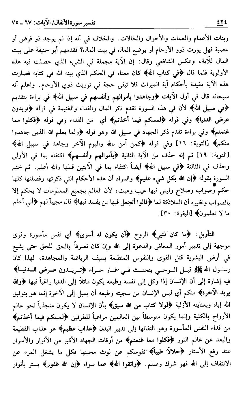 ما كانَ لِنَبِيٍّ الروح أَنْ يَكُونَ لَهُ أَسْرى أي نفس مأسورة وقوى موجهة إلى تدبير أمور المعاش والدعوة إلى الله وإن كان تصرفا بالحق للحق حتى يشيع في أرض البشرية قتل القوى والنفوس المنطبعة بسيف الرياضة والمجاهدة، لهذا كان رسول الله صلى الله عليه وسلم قبل الوحي يتحنث في غار حراء تُرِيدُونَ عَرَضَ الدُّنْيا فيه إشارة إلى أن الإنسان إذا وكل إلى نفسه وطبعه يكون مائلا إلى الدنيا راغبا فيها وَاللَّهُ يُرِيدُ الْآخِرَةَ منكم أي ليس الإنسان من سجيته وطبعه أن يميل إلى الآخرة إنما هو بتوفيق الله إياه وبعنايته الأزلية لَوْلا كِتابٌ مِنَ اللَّهِ سَبَقَ بأن الإنسان لا يكون منجذبا نحو عالم الأرواح بالكلية وإنما يكون متوسطا بين العالمين مراعيا للطرفين لَمَسَّكُمْ فِيما أَخَذْتُمْ من فداء النفس المأسورة وهو التفاتها إلى تدبير البدن عَذابٌ عَظِيمٌ هو عذاب القطيعة والبعد عن عالم النور فَكُلُوا مِمَّا غَنِمْتُمْ من أوقات الجهاد الأكبر من الأنوار والأسرار عند رفع الأستار حَلالًا طَيِّباً نفوسكم عن لوث محبنها فكل ما يشغل المرء عن الالتفات إلى الله فهو شرك وصنم. وَاتَّقُوا اللَّهَ عما سواه إِنَّ اللَّهَ غَفُورٌ يستر بأنوار