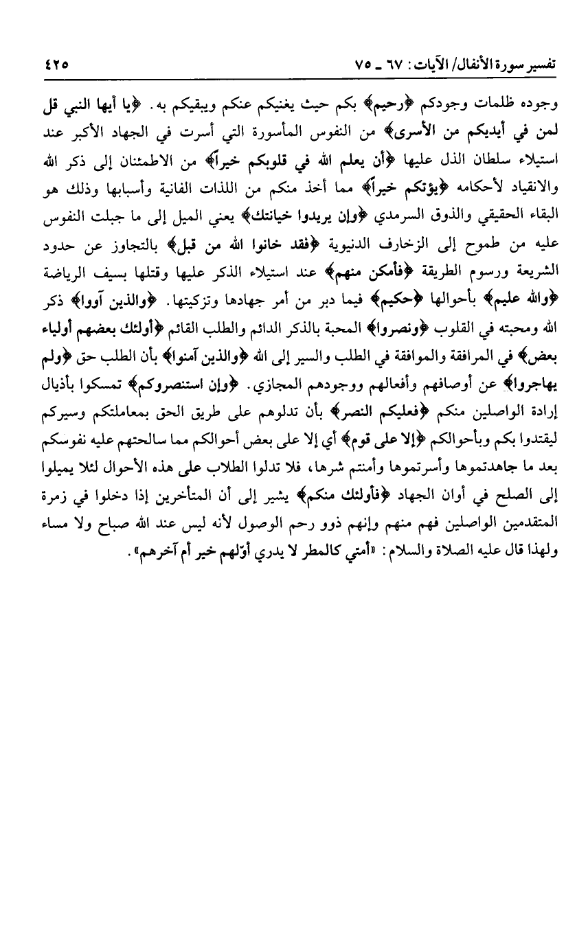 وجوده ظلمات وجودكم رَحِيمٌ بكم حيث يغنيكم عنكم ويبقيكم به. يا أَيُّهَا النَّبِيُّ قُلْ لِمَنْ فِي أَيْدِيكُمْ مِنَ الْأَسْرى من النفوس المأسورة التي أسرت في الجهاد الأكبر عند استيلاء سلطان الذل عليها إِنْ يَعْلَمِ اللَّهُ فِي قُلُوبِكُمْ خَيْراً من الاطمئنان إلى ذكر الله والانقياد لأحكامه يُؤْتِكُمْ خَيْراً مما أخذ منكم من اللذات الفانية وأسبابها وذلك هو البقاء الحقيقي والذوق السرمدي وَإِنْ يُرِيدُوا خِيانَتَكَ يعني الميل إلى ما جبلت النفوس عليه من طموح إلى الزخارف الدنيوية فَقَدْ خانُوا اللَّهَ مِنْ قَبْلُ بالتجاوز عن حدود الشريعة ورسوم الطريقة فَأَمْكَنَ مِنْهُمْ عند استيلاء الذكر عليها وقتلها بسيف الرياضة وَاللَّهُ عَلِيمٌ بأحوالها حَكِيمٌ فيما دبر من أمر جهادها وتزكيتها. وَالَّذِينَ آوَوْا ذكر الله ومحبته في القلوب وَنَصَرُوا المحبة بالذكر الدائم والطلب القائم أُولئِكَ بَعْضُهُمْ أَوْلِياءُ بَعْضٍ في المرافقة والموافقة في الطلب والسير إلى الله وَالَّذِينَ آمَنُوا بأن الطلب حق وَلَمْ يُهاجِرُوا عن أوصافهم وأفعالهم ووجودهم المجازي. وَإِنِ اسْتَنْصَرُوكُمْ تمسكوا بأذيال إرادة الواصلين منكم فَعَلَيْكُمُ النَّصْرُ بأن تدلوهم على طريق الحق بمعاملتكم وسيركم ليقتدوا بكم وبأحوالكم إِلَّا عَلى قَوْمٍ أي إلا على بعض أحوالكم مما سالحتهم عليه نفوسكم بعد ما جاهدتموها وأسرتموها وأمنتم شرها، فلا تدلوا الطلاب على هذه الأحوال لئلا يميلوا إلى الصلح في أوان الجهاد فَأُولئِكَ مِنْكُمْ يشير إلى أن المتأخرين إذا دخلوا في زمرة المتقدمين الواصلين فهم منهم وإنهم ذوو رحم الوصول لأنه ليس عند الله صباح ولا مساء ولهذا