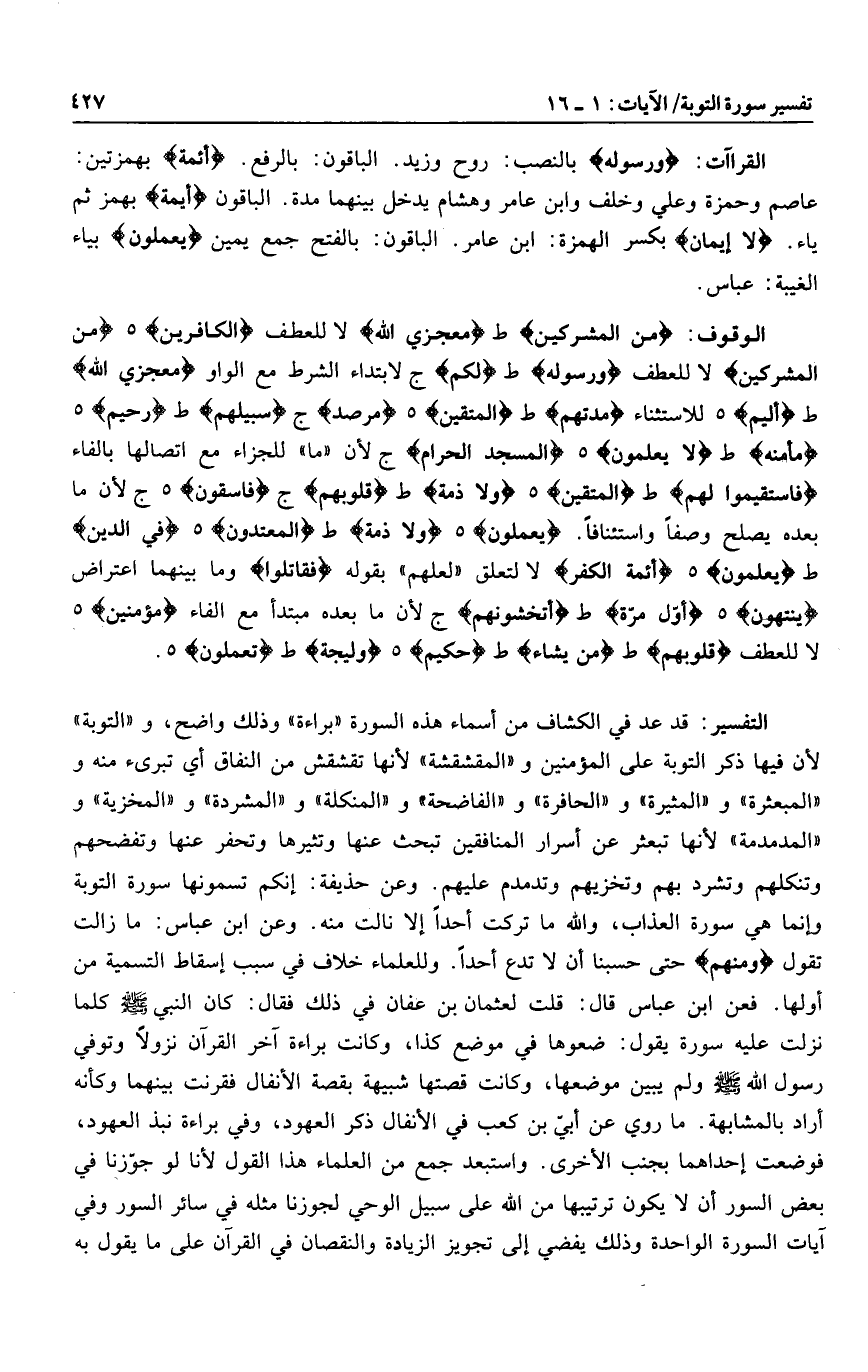 مِنَ الْمُشْرِكِينَ ط مُعْجِزِي اللَّهِ لا للعطف الْكافِرِينَ هـ مِنَ الْمُشْرِكِينَ لا للعطف وَرَسُولِهِ ط لَكُمْ ج لابتداء الشرط مع الواو مُعْجِزِي اللَّهِ ط أَلِيمٍ هـ للاستثناء مُدَّتِهِمْ ط الْمُتَّقِينَ هـ مَرْصَدٍ ج سَبِيلَهُمْ ط رَحِيمٌ هـ مَأْمَنَهُ ط لا يَعْلَمُونَ هـ الْمَسْجِدِ الْحَرامِ ج لأن «ما» للجزاء مع اتصالها بالفاء فَاسْتَقِيمُوا لَهُمْ ط الْمُتَّقِينَ هـ وَلا ذِمَّةً ط قُلُوبُهُمْ ج فاسِقُونَ هـ ج لأن ما بعده يصلح وصفا واستئنافا. يَعْمَلُونَ هـ وَلا ذِمَّةً ط الْمُعْتَدُونَ هـ فِي الدِّينِ ط يَعْلَمُونَ هـ أَئِمَّةَ الْكُفْرِ لا لتعلق «لعلهم» بقوله فَقاتِلُوا وما بينهما اعتراض يَنْتَهُونَ هـ أَوَّلَ مَرَّةٍ ط أَتَخْشَوْنَهُمْ ج لأن ما بعده مبتدأ مع الفاء مُؤْمِنِينَ هـ لا للعطف قُلُوبِهِمْ ط مَنْ يَشاءُ ط حَكِيمٌ هـ وَلِيجَةً ط تَعْمَلُونَ هـ.