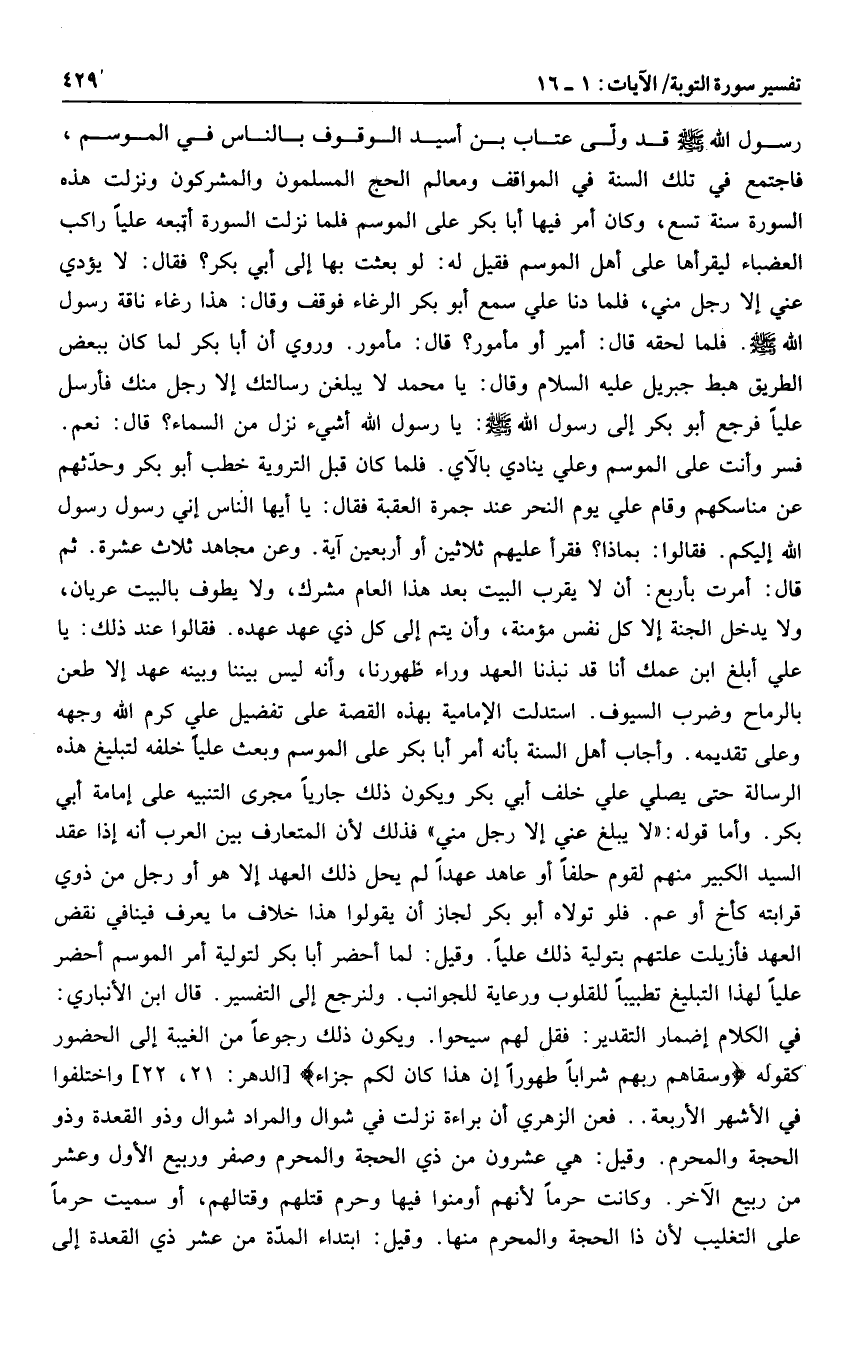 رسول الله صلى الله عليه وسلم قد ولّى عتاب بن أسيد الوقوف بالناس في الموسم، فاجتمع في تلك السنة في المواقف ومعالم الحج المسلمون والمشركون ونزلت هذه السورة سنة تسع، وكان أمر فيها أبا بكر على الموسم فلما نزلت السورة أتبعه عليا راكب العضباء ليقرأها على أهل الموسم فقيل له: لو بعثت بها إلى أبي بكر؟ فقال: لا يؤدي عني إلا رجل مني، فلما دنا علي سمع أبو بكر الرغاء فوقف وقال: هذا رغاء ناقة رسول الله صلى الله عليه وسلم. فلما لحقه قال: أمير أو مأمور؟ قال: مأمور.