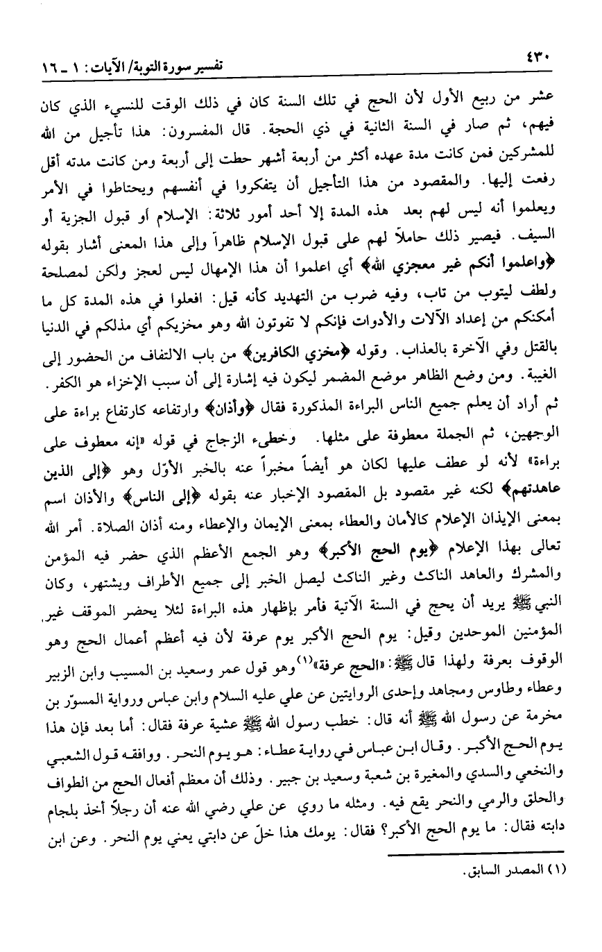 ثم أراد أن يعلم جميع الناس البراءة المذكورة فقال وَأَذانٌ وارتفاعه كارتفاع براءة على الوجهين، ثم الجملة معطوفة على مثلها. وخطىء الزجاج في قوله «إنه معطوف على براءة» لأنه لو عطف عليها لكان هو أيضا مخبرا عنه بالخبر الأوّل وهو إِلَى الَّذِينَ عاهَدْتُمْ لكنه غير مقصود بل المقصود الإخبار عنه بقوله إِلَى النَّاسِ والأذان اسم بمعنى الإيذان الإعلام كالأمان والعطاء بمعنى الإيمان والإعطاء ومنه أذان الصلاة. أمر الله تعالى بهذا الإعلام يَوْمَ الْحَجِّ الْأَكْبَرِ وهو الجمع الأعظم الذي حضر فيه المؤمن والمشرك والعاهد الناكث وغير الناكث ليصل الخبر إلى جميع الأطراف ويشتهر، وكان النبي صلى الله عليه وسلم يريد أن يحج في السنة الآتية فأمر بإظهار هذه البراءة لئلا يحضر الموقف غير المؤمنين الموحدين وقيل: يوم الحج الأكبر يوم عرفة لأن فيه أعظم أعمال الحج وهو الوقوف بعرفة ولهذا