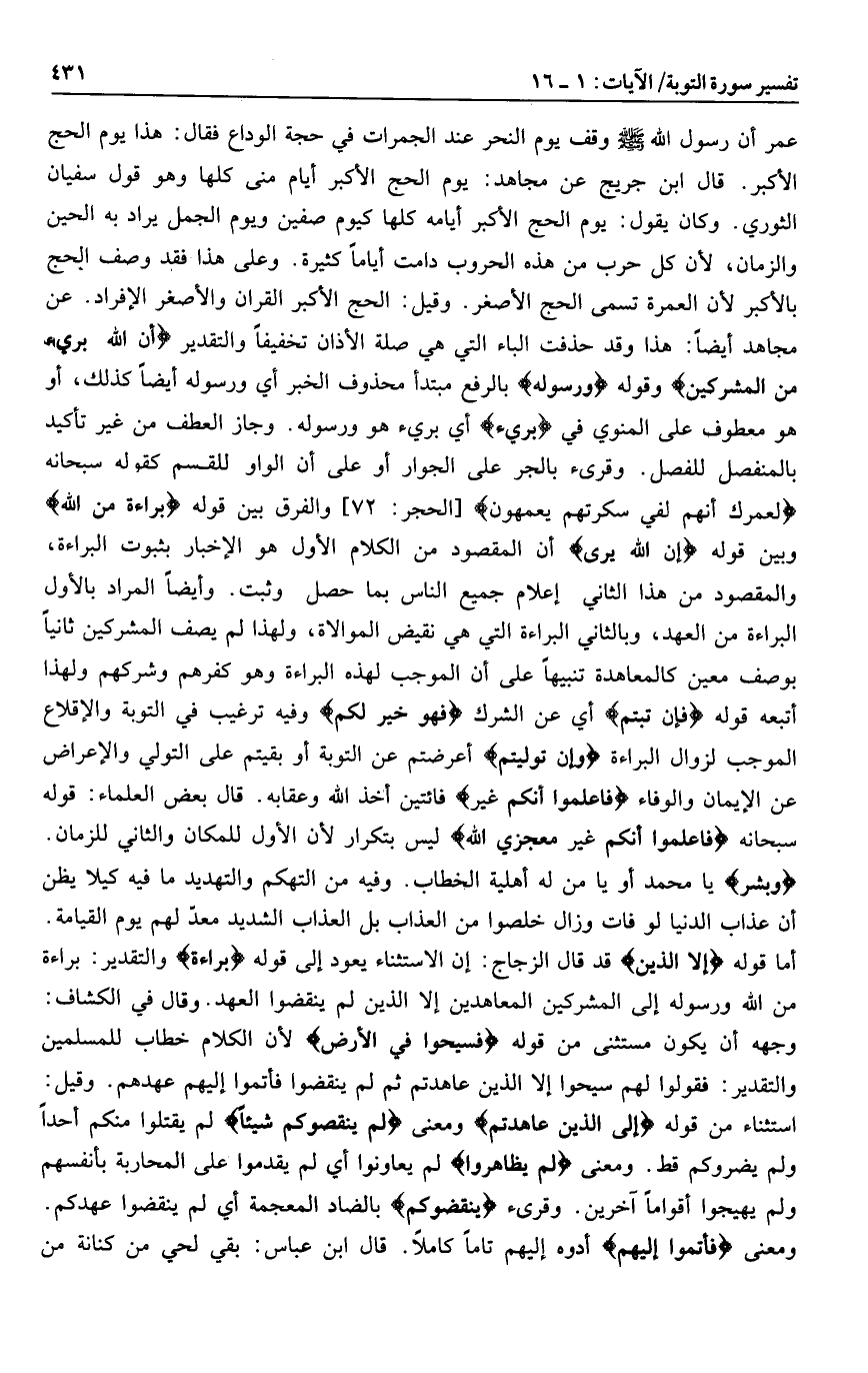 قال ابن جريج عن مجاهد: يوم الحج الأكبر أيام منى كلها وهو قول سفيان الثوري. وكان يقول: يوم الحج الأكبر أيامه كلها كيوم صفين ويوم الجمل يراد به الحين والزمان، لأن كل حرب من هذه الحروب دامت أياما كثيرة. وعلى هذا فقد وصف الحج بالأكبر لأن العمرة تسمى الحج الأصغر. وقيل: الحج الأكبر القران والأصغر الإفراد. عن مجاهد أيضا: هذا وقد حذفت الباء التي هي صلة الأذان تخفيفا والتقدير أَنَّ اللَّهَ بَرِيءٌ مِنَ الْمُشْرِكِينَ وقوله وَرَسُولِهِ بالرفع مبتدأ محذوف الخبر أي ورسوله أيضا كذلك، أو هو معطوف على المنوي في بَرِيءٌ أي بريء هو ورسوله. وجاز العطف من غير تأكيد بالمنفصل للفصل. وقرىء بالجر على الجوار أو على أن الواو للقسم كقوله سبحانه لَعَمْرُكَ إِنَّهُمْ لَفِي سَكْرَتِهِمْ يَعْمَهُونَ [الحجر: 72] والفرق بين قوله بَراءَةٌ مِنَ اللَّهِ وبين قوله أَنَّ اللَّهَ بَرِيءٌ أن المقصود من الكلام الأول هو الإخبار بثبوت البراءة، والمقصود من هذا الثاني إعلام جميع الناس بما حصل وثبت. وأيضا المراد بالأول البراءة من العهد، وبالثاني البراءة التي هي نقيض الموالاة، ولهذا لم يصف المشركين ثانيا بوصف معين كالمعاهدة تنبيها على أن الموجب لهذه البراءة وهو كفرهم وشركهم ولهذا أتبعه قوله فَإِنْ تُبْتُمْ أي عن الشرك فَهُوَ خَيْرٌ لَكُمْ وفيه ترغيب في التوبة والإقلاع الموجب لزوال البراءة وَإِنْ تَوَلَّيْتُمْ أعرضتم عن التوبة أو بقيتم على التولي والإعراض عن الإيمان والوفاء فَاعْلَمُوا أَنَّكُمْ غَيْرُ فائتين أخذ الله وعقابه. قال بعض العلماء: قوله سبحانه فَاعْلَمُوا أَنَّكُمْ غَيْرُ مُعْجِزِي اللَّهِ ليس بتكرار لأن الأول للمكان والثاني للزمان.