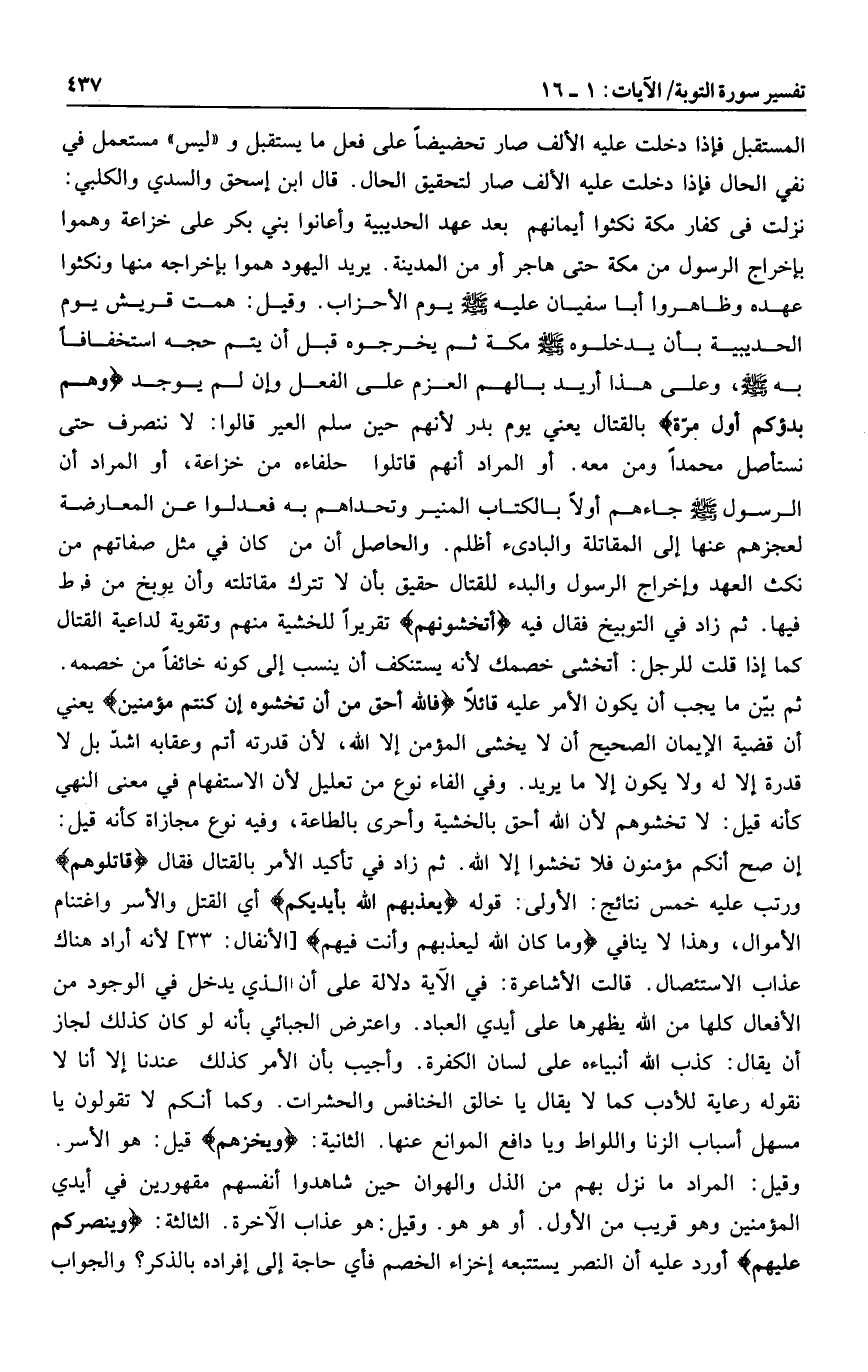إن صح أنكم مؤمنون فلا تخشوا إلا الله. ثم زاد في تأكيد الأمر بالقتال فقال قاتِلُوهُمْ ورتب عليه خمس نتائج: الأولى: قوله يُعَذِّبْهُمُ اللَّهُ بِأَيْدِيكُمْ أي القتل والأسر واغتنام الأموال، وهذا لا ينافي وَما كانَ اللَّهُ لِيُعَذِّبَهُمْ وَأَنْتَ فِيهِمْ [الأنفال: 33] لأنه أراد هناك عذاب الاستئصال. قالت الأشاعرة: في الآية دلالة على أن الذي يدخل في الوجود من الأفعال كلها من الله يظهرها على أيدي العباد. واعترض الجبائي بأنه لو كان كذلك لجاز أن يقال: كذب الله أنبياءه على لسان الكفرة. وأجيب بأن الأمر كذلك عندنا إلا أنا لا نقوله رعاية للأدب كما لا يقال يا خالق الخنافس والحشرات. وكما أنكم لا تقولون يا مسهل أسباب الزنا واللواط ويا دافع الموانع عنها. الثانية: وَيُخْزِهِمْ قيل: هو الأسر.